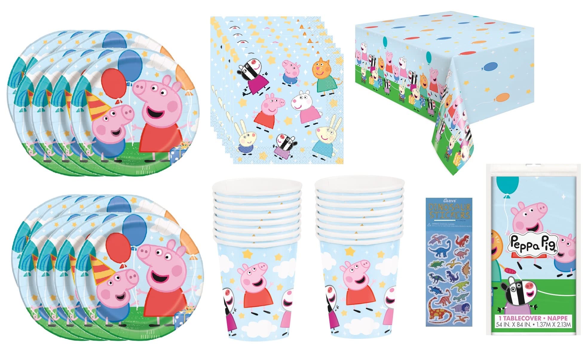 Peppa Pig Birthday Party Supplies Bundle for 16 Includes: 16 Lunch Plates 9", 16 Lunch Napkins 6.5", 16 Paper Cups 9oz, 1 Plastic Table Cover 54"x84", 1 Eave Sticker Sheet (not Peppa Pig stickers). Plates, Cups, Napkins are Made in USA. Peppa Pig Birthday Party Supplies Bundle for 16 Includes 16 Lunch Plates 9", 16 Lunch Napkins 6.5", 16 Paper Cups 9oz, 1 Plastic Table Cover 54"x84", 1 Eave Sticker Sheet (not Peppa Pig stickers). Plates, Cups, Napkins are Made in USA.