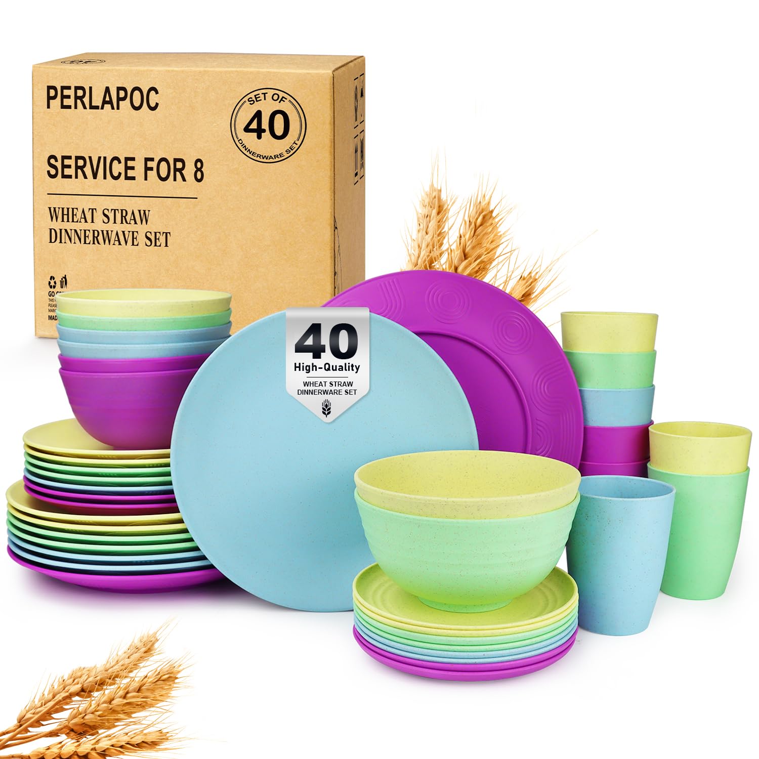PREMIUM WHEAT STRAW FIBER & PERFECT COMBINATION :Our wheat straw dinnerware set is made from PREMIUM wheat straw fiber and our perlapoc brand brings you a wheat straw dinnerware set which comes with 8 x 10 inch plate , 8 x 9 inch plate, 8 x 6 inch plate, 8 x 26 oz bowls and 8 x wheat straw drinking cups SAFE & RELIABLE: We carefully crafted a set of dinnerware set for you. It is carefully made of high-quality wheat straw fiber and BPA-free PP material. It is not only reusable, but also protects the health of you and your family because its material does not contain harmful chemicals LIGHTWEIGHT & PRACTICAL: This dishes set are sturdy and practical, and it is safe even if it is accidentally dropped. Its lightweight design allows children to easily enjoy the fun of dining without worries. Whether it is adults or the elderly, this plastic dinnerware set can adapt perfectly. It is not only a practical dinnerware, but also a life attitude DISHWASHER & MICROWAVE SAFE: This plates and bowls sets adopts stacking design, saving every inch of space. When you put it in the dishwasher, the smooth surface is like a mirror, without any dirt. Its heat-resistant performance can evenly heat the heat waves of the microwave, and will not change its original color ELEGANT DESIGN: The dinner set features an elegant and modern design. Each plate is embellished with delicate linear embossed patterns. The non-slip design on the bottom is both stable. The combination of 40 sets in 4 colors brings a touch of art to your dining table. It is perfect as a gift and a blessing for holidays, birthdays, weddings and housewarming QUALITY CHOICE - PERLAPOC: Our carefully selected dishes sets are not only suitable for daily use, but also ideal for conveying your feelings. Perlapoc is confident in every product, and we are committed to satisfying every customer. Our goal is not only to meet your needs, but also to exceed your expectations With our ingenuity, we present an artistic gift to your dining table - a 40-piece wheat straw dinnerware set. This series is like a feast for the eyes and taste. This series includes dinner plates, dessert plates, kids plates, serving bowls and drinking cups. Each piece has been carefully designed. The 8-person set can meet the dining needs of you and your family or friends, making every gathering a warm and satisfying time. Selected wheat straws are skillfully carved into lightweight and practical dinnerware sets. Whether it is camping or picnic outdoors, or in the kitchen and restaurant at home, or in the RV on the road, they are your most reliable companions. Their light and sturdy allows you to enjoy delicious food without worrying about accidental damage. A touch of bright dishes set brings a touch of modern elegance to the dining table. Every piece of dinnerware is our interpretation of a better life. The 10-inch dinner plate carries your infinite love for food; the 9-inch dessert plate shows the delicacy and elegance of desserts; the 6-inch small plate satisfies children's dining pleasure; the 26-ounce cereal bowl meets all your expectations for breakfast; the 12-ounce water cup accompanies you through every morning coffee time or afternoon tea break. Each piece of dinnerware is carefully designed and suitable for microwave and dishwasher, making it easy and simple to clean. 🌼Our Dinnerware set is not only practical, but also combines modern design with special linear patterns engraved on the plates. It is an indispensable work of art on your dining table and a good choice for holiday gifts. A complete dinnerware set is a must-have for your first apartment essentials, including plates, bowls and cups, to ensure you have everything needed for dining and entertaining.Choose our 40-piece plates and bowls sets to sublimate your dining experience into the art of life. This is not just a set of dinnerware, but also a commitment to a better life, making every meal a pleasant enjoyment and every moment of life full of ritual and poetry. (plates and bowls sets home essentials kitchen essentials dinnerware sets dish set dinnerware sets for 8 dishes set for 8 plates and bowls sets for 8 kitchen plates and bowls set bowls for kitchen camping plates camping dishes)