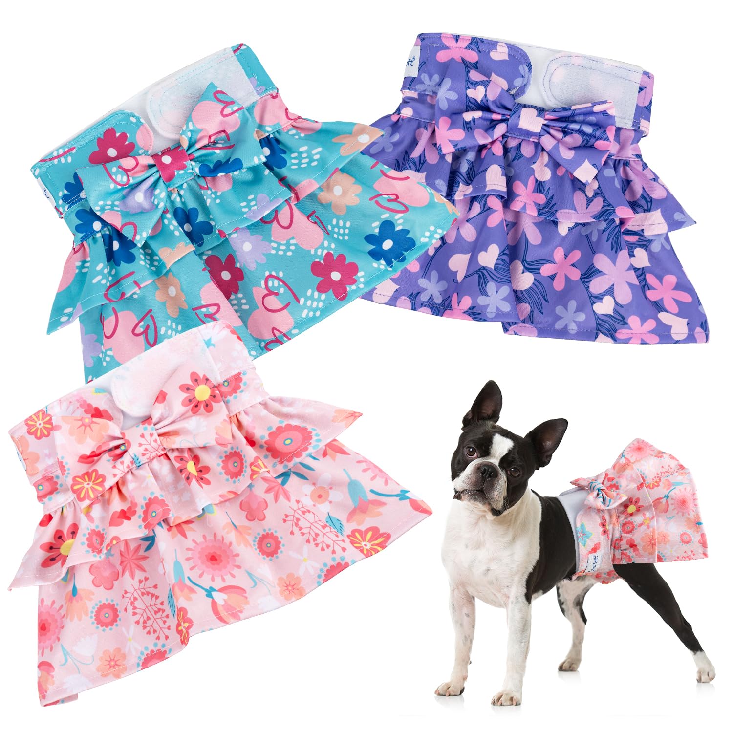 Fairy Dog Dress: New Design on reusable female dog diapers super cute for your doggy get compliment every time by wearing it 3 Counts 1 Pack: With 3 cute patterns, our washable dog diapers excellent for more pets or accidents, economical & reusable Fast Absorbent: Our reusable female dog diapers with 2-3 absorb layers, absorb fast, no worry about leakage, eazy clean machine washable Multi Use: Easy to put on and take off, our pet period diapers useful for untrained puppies, female dogs in heat, excitement urination or incontinence Soft & Sturdy: Cozy mesh pads and well-tailored fabric, our dog diaper female increasing pet's comfort and standing frequent washing and everyday use Pet Soft Puppy Diapers Female: Waist XS 7-10", S 10-14", M 14-19", L 19-25", XL 25-33", please measure your dog's wasit according to our size chart to good fit Pet Soft Female Dog Diapers - 3Pack Washable Dress-style Dog Diapers Female for Girl Dog in Heat - Reusable Dog Period Panties