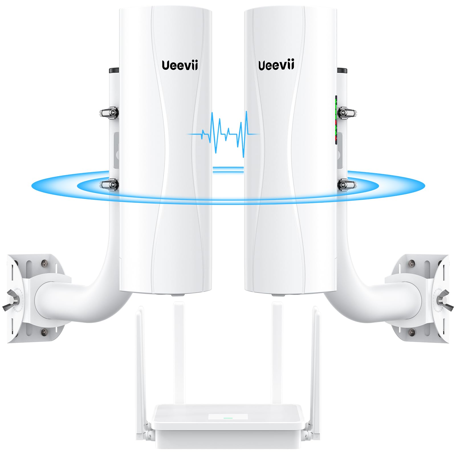 Comprehensive Wireless Bridge Kit: Includes two 5.8G wireless bridges, adjustable installation brackets, and a high-speed WiFi 6 AX3000 dual-band router – an all-in-one solution for network extension and WiFi broadcasting 5KM Point-to-Point Transmission: Wireless bridges support long-distance transmission up to 5 kilometers, ensuring stable data transfer for surveillance systems, remote offices, or outbuildings Dual Gigabit Ethernet Ports: Both wireless bridges come equipped with dual Gigabit RJ45 ports, offering fast wired connections for devices that require reliable high-speed internet access 48V PoE Power Supply: The wireless bridges support 48V Power over Ethernet (PoE), providing both power and data transmission through a single cable, simplifying the installation process Adjustable Mounting Brackets: The included installation brackets allow for both pole and wall-mounted setups, featuring angle adjustment for optimal alignment and easier setup Seamless WiFi 6 AX3000 Router: The WiFi 6 router provides ultra-fast speeds up to 3000Mbps, with dual-band frequencies (2.4GHz and 5GHz), perfect for delivering stable WiFi to remote areas via the bridge system Expand Your Network Effortlessly: Ideal for extending your home or business network to remote locations such as barns, workshops, garages, and other outdoor buildings Weather-Resistant Design: Built to withstand outdoor environments, the wireless bridges feature IP66 weatherproofing, making them resistant to rain, dust, and extreme temperatures Plug & Play Setup: Pre-configured for easy installation, no advanced networking knowledge required—simply mount, connect, and enjoy stable network coverage Compatible with Multiple Devices: Works seamlessly with various networking devices including surveillance cameras, smart home devices, and office systems, providing a reliable long-range connection The UeeVii Wireless Bridge Bundle provides a comprehensive solution for extending your network to multiple locations, ensuring seamless WiFi coverage and fast internet speeds. This all-in-one package includes a gigabit-speed wireless bridge with a 5KM point-to-point range, a versatile adjustable mounting bracket, and a high-performance AX3000 Wi-Fi 6 router. It’s the perfect choice for both home and business users looking to optimize their wireless network. The UeeVii Gigabit Wireless Bridge in this bundle offers impressive speeds of up to 1000Mbps, supporting stable and reliable connections over long distances (up to 5KM). Whether you're connecting buildings on your property, or extending WiFi to a barn, shop, or garage, this wireless bridge delivers exceptional performance. Its dual Gigabit Ethernet ports make it compatible with a wide range of devices, ensuring seamless communication between your devices and network. Included in the bundle is a high-quality adjustable mounting bracket that allows for easy installation of the wireless bridge. The bracket can be mounted on a pole or wall, and its adjustable design lets you position the bridge at the optimal angle for the best signal reception. No more complicated setups — just attach and adjust for the perfect fit. The AX3000 Wi-Fi 6 Router ensures that all your connected devices get the highest speeds available. It supports dual bands (2.4GHz and 5GHz) and uses Wi-Fi 6 technology to offer faster, more stable connections across your entire home or property. With speeds of up to 3000Mbps, the AX3000 router is perfect for HD streaming, online gaming, and running multiple devices simultaneously without sacrificing performance. Setting up this system is a breeze. All devices in this bundle are pre-configured and ready to go. With easy-to-follow instructions and a simple dial-code pairing method for the wireless bridge, you’ll be up and running in no time. The setup is designed to be user-friendly for anyone, whether you're a tech pro or a beginner. Whether you're extending internet to your second home, providing WiFi to your shop, or ensuring fast, reliable coverage in outdoor spaces, the UeeVii Wireless Bridge Bundle provides everything you need for a seamless, high-performance network setup.