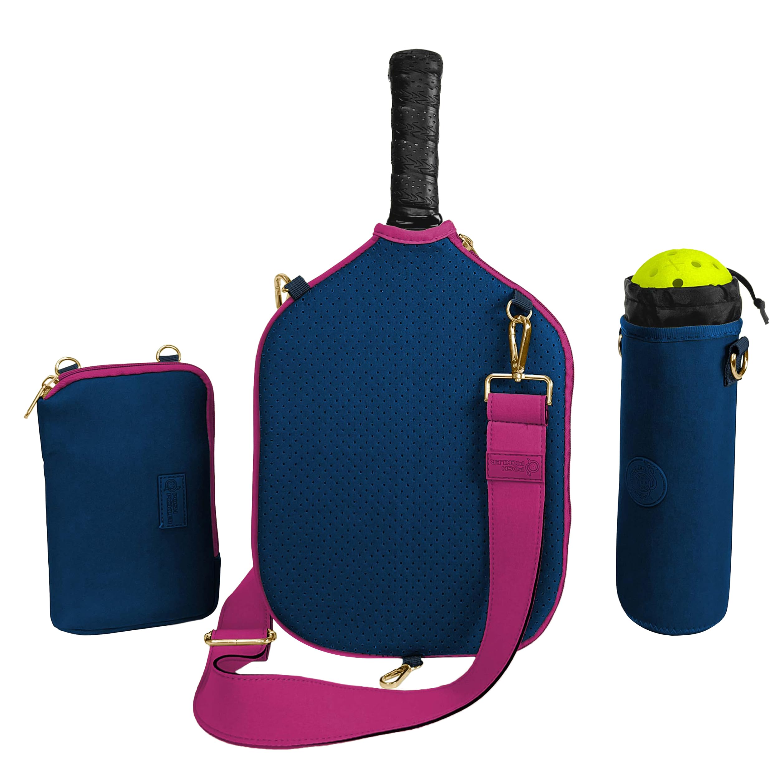 Our Best-Selling Essentials, Designed to Work Together: This bundle includes a weather-resistant paddle cover with adjustable crossbody strap, a clip-on zippered pouch, and a clip-on drawstring pouch for your bottle or pickleballs—hands free for any game. NOTE: PADDLE IS NOT INCLUDED Stay Organized, Stay Ready: Keep sunglasses, water bottle, pickleballs, or other essentials within easy reach; Each clip-on pouch secures to your paddle cover, giving you hands-free convenience and quick access during matches or daily errands Weather-Ready Resilience: Rain or shine, durable neoprene shields your gear from the elements; Designed for active players, it keeps your pickleball accessories protected, organized, and ready to perform wherever you play or travel Hands-Free Comfort at Your Fingertips: Adjust the crossbody strap for a custom fit; Whether commuting, traveling, or heading to the courts, enjoy effortless comfort and mobility with every swing, step, or spontaneous game on the go Play with Purpose: Protect your paddle in a durable, weather-resistant cover that fits all standard paddles; With coordinating add-on pouches, this gift set keeps your pickleball gear stylish, secure, and ready for every match Step onto the court with everything you need right by your side. The Posh Pickler Crossbody Paddle Cover & Pickleball Accessory Bundle isn’t just about carrying your gear, it’s about elevating your game with effortless style and function. Whether you’re a seasoned player or just discovering the joy of pickleball, this bundle keeps your essentials organized, protected, and always within reach. Crossbody Paddle Cover: Crafted from durable, weather-resistant neoprene, this sleek cover shields your paddle from moisture, scratches, and daily wear. It features a built-in storage pocket for small essentials and a sewn-in fence clip that lets you hang your cover while you play. The adjustable, removable crossbody strap ensures a comfortable, hands-free carrying experience that moves effortlessly from work to the court. Dimensions: Fits standard paddles per USAPA guidelines