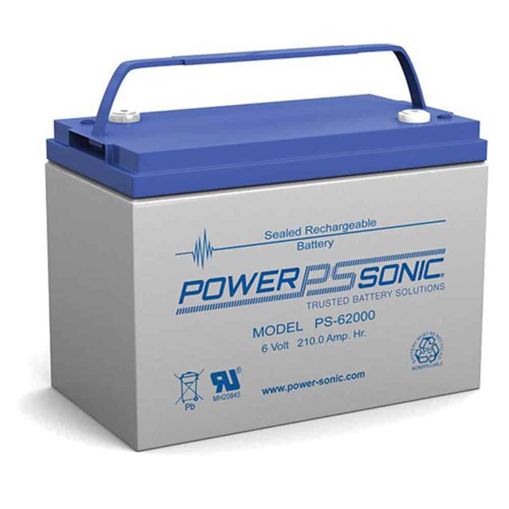 Brand New - Factory Fresh Maintenance Free & Spill Proof Design - Can be Mounted in Any Position AGM Absorbent Glass Mat Technology- Rechargeable Power-Sonic PS-62000 6 volt 200 Ah Rechargeable SLA battery. Our Power Sonic PS-62000; is commonly used in emergency lighting, UPS Systems, Industrial Equipment, Equipment, Railroad Signals, Aircraft Signals, Power Back-Up and industrial equipment. Chemistry: Rechargeable Sealed Lead Acid / Terminal Type: T8 / FEATURES: Absorbent Glass Mat (AGM) technology for superior performance, valve regulated, spill proof construction allows safe operation in any position, Power/volume ratio yielding unrivaled energy density, Rugged impact resistant ABS case and cover (UL94-HB). Approved for transport by air. D.O.T., I.A.T.A., F.A.A. and C.A.B., certified U.L., recognized under fi le number MH 20845