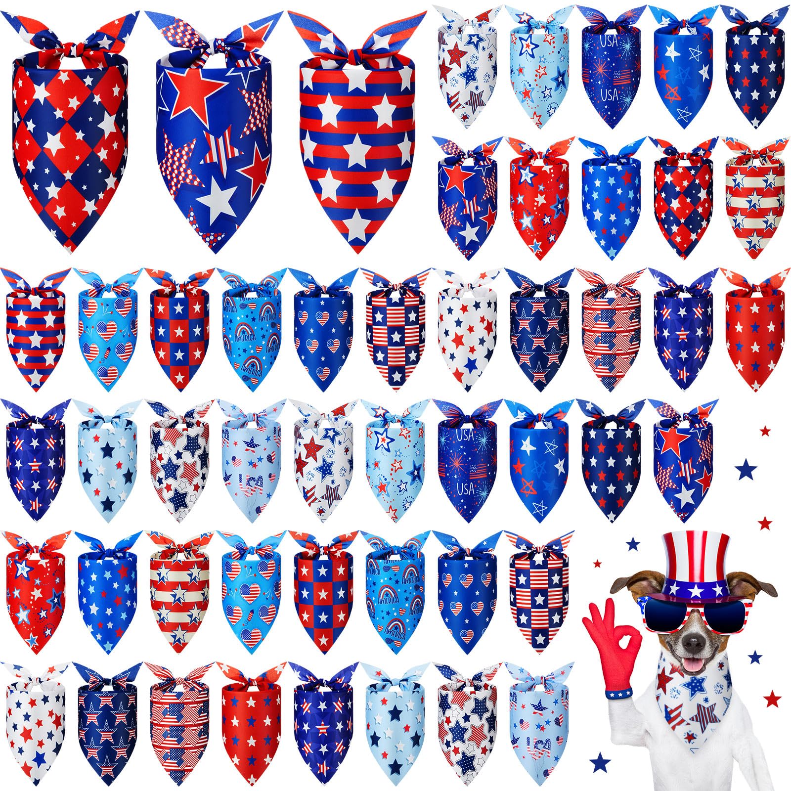 Rich Quantity: you will receive 50 pieces patriotic bandanas for dogs in 25 styles, 2 pieces for each style, enough quantity and various styles can meet you to choose to dress up your pet's on memorial parties or other costume parties or share with your family or mates who have lovely pets Patriotic Designs: these dog bandanas bulk are printed with various patriotic designs, such as star, america, USA, american flag and more other elements, full of warm festival atmosphere, adding a cute touch to your pet's outfit Size Information: these star dog bandanas for dogs are approx. 19.7 x 13.8 x 13.8 inches/ 50 x 35 x 35 cm, adjustable and foldable, suitable for most small, medium, large size dogs, cats, and other lovely pets; Please confirm the size information before purchasing Soft and Reliable Material: these red blue and white dog bandanas are made of quality polyester material, lightweight and breathable, machine washable and easy to clean, giving your pet's a nice use experience Wide Application: these independence day dog bandanas are not only can be applied as dog bandanas, bibs, scarves and handkerchief, but also ideal accessories for memorial day parties, 4 of July parties, vanteran parties, costume parties and family outing, dress up your pets and take them to party, let them join in the festival fun; And they also can be as patriotic gifts for groomers, pet owners and pet shops Features: Different ways to use: Patriotic dog bandanas bulk can be applied as bandanas, ties, scarves, headbands, etc., you can fold them for any shape what you want.