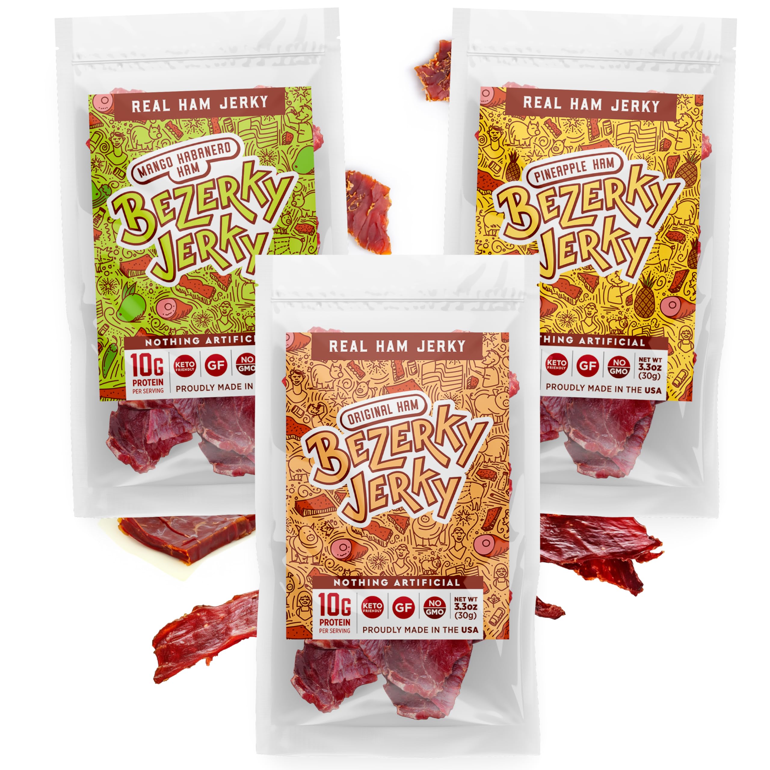 Ham Jerky Variety Pack: Enjoy the traditional American snacks with Bezerky Jerky. Packed with protein, this variety pack ensures healthy, everyday low-calorie snacks that cater to your taste buds and your well-being. Great as a gift for men. PREMIUM 100% HAM: Crafted exclusively from 100% ham, our jerky delivers a premium flavor that promises a taste experience that'll have you shoutin' 'Yeehaw! Elevate your snacking to a new level of deliciousness with our exquisite bacon like jerky. AMERICAN MADE NATURAL GOODNESS: Our commitment to purity means steering clear of artificial ingredients, so you can enjoy the full benefits of nature's goodness in every bite. Plus, rest easy knowing our jerky is free from hormones, ensuring a snack that's as wholesome as it is delicious. CRAFTED IN SMALL BATCHES: Our devoted team takes the slow route, drying each batch with precision. This dedication ensures a rich taste that stands out, making our jerky a true masterpiece in quality and flavor. ELEVATE DULL MOMENTS: Whether you're feeling the doldrums during a movie night with your date, watching a slow school soccer game, trekking through the wilderness, or hustling your way to the office, our jerky pack is your ultimate companion, ready to spice up any moment.