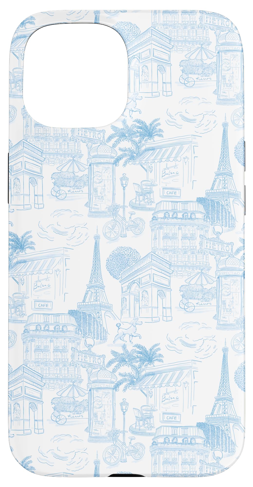 French Parisian Style design. Parisian scenes with French landmarks like Arc de Triomphe, Eiffel Tower, Manicured Trees, French Cafe, French Flowers, Bicycle. A preppy Chinoiserie European Vacation toile du jouy pattern in Pastel Blue, Light Blue. Two-part protective case made from a premium scratch-resistant polycarbonate shell and shock absorbent TPU liner protects against drops Printed in the USA Easy installation