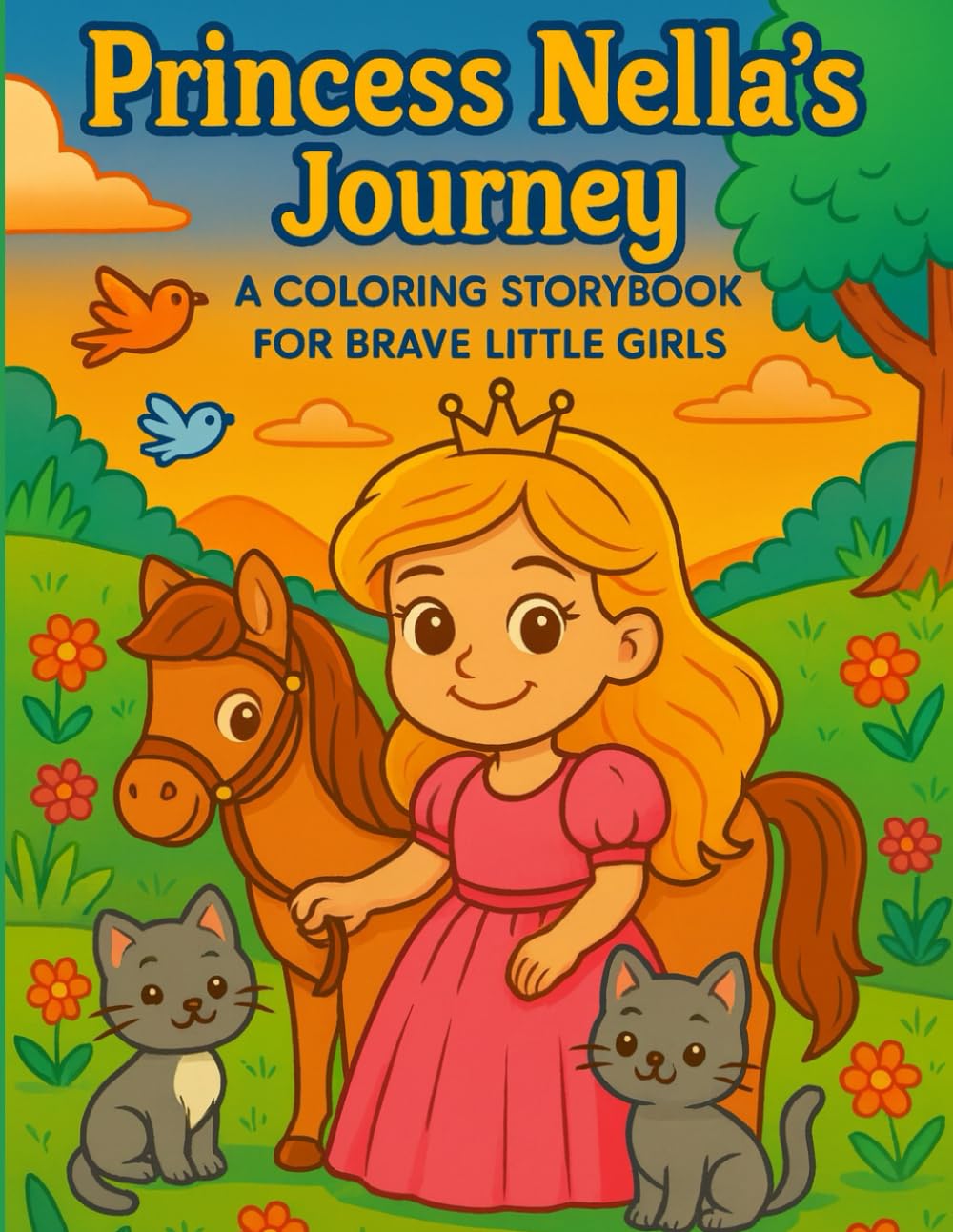 📖 Princess Nella’s Journey A Coloring Storybook for Brave Little Girls Step into a magical world of imagination and adventure with Princess Nella ! This enchanting coloring storybook is specially made for brave little girls who love tales of courage, friendship, and creativity. Join Princess Nella, her loyal horse Bella, and her curious kitten Tiko as they set off on a heartwarming journey through enchanted forests, blooming meadows, and hidden paths. Each page combines a short story with charming illustrations your child can bring to life with color! 🌟 What’s inside: A full storybook told in short, easy-to-read chapters 20+ unique coloring pages that match the story - Inspiring themes of bravery, kindness, and imagination - Perfect for girls ages 4 to 8 - A wonderful gift for birthdays, holidays, or quiet creative time Whether your child reads it on her own or colors with a loved one, Princess Nella’s Journey will inspire big dreams and hours of creative fun. 🔸 Trim Size : 8.5 x 11 inches 🔸 Pages : ~40–50 🔸 Cover : Soft Matte Finish 🔸 Interior : Black & White Coloring Pages with Story Text