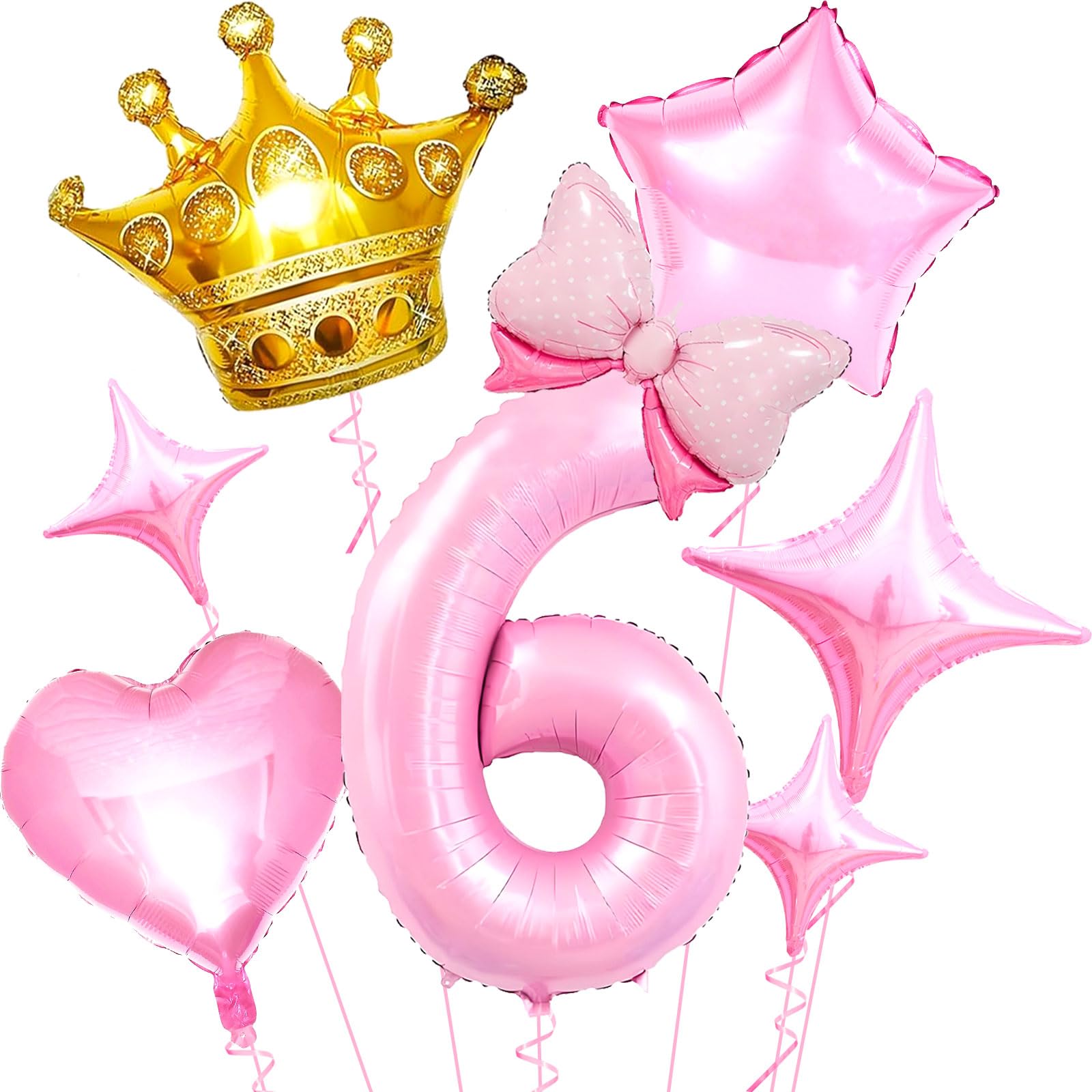 Pack of 8 princess birthday decorations, include 40inch pink number 6 balloons 1pcs, 28 inch crown balloons 1pcs, 18 inch four-angle star balloons 1pcs, 18 inch heart balloons 1pcs, 18 inch star balloons 1pcs, 15 inch bow balloons 1pcs, 10 inch four-angle star balloons 2pcs.