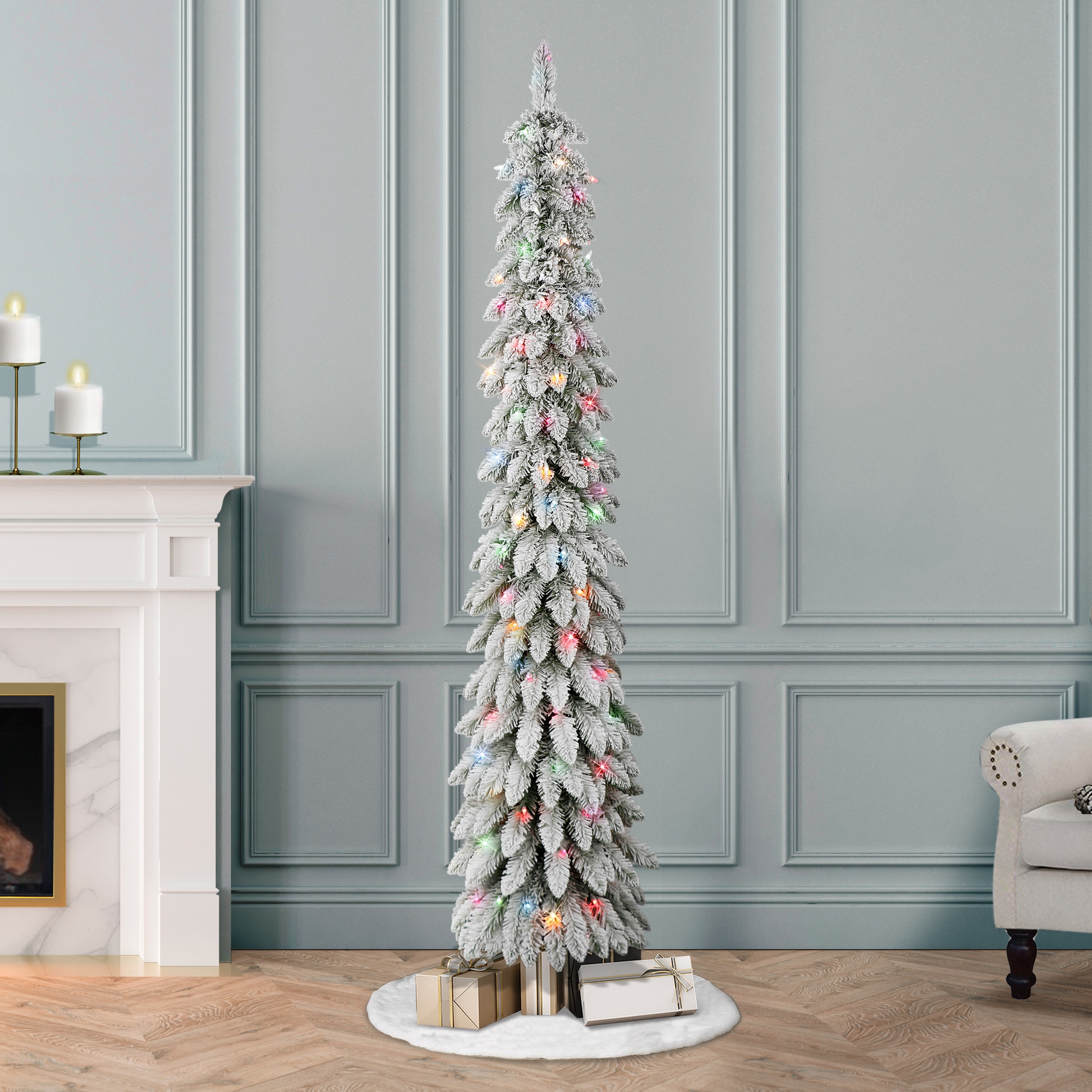 Embrace the joy of the holiday season into your home with the Puleo International Pre-Lit Flocked Alpine Pencil Christmas Tree.