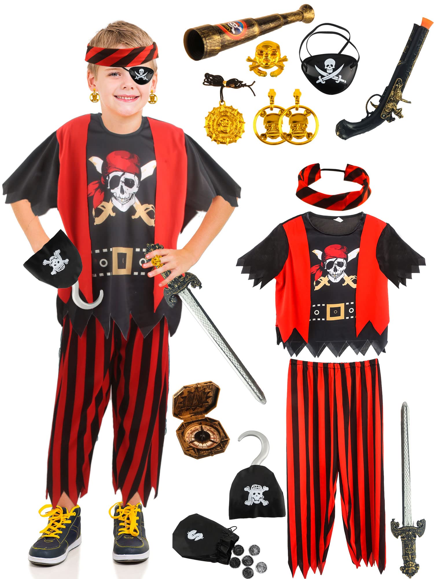 Detailed size: Our kids pirate dress up costumes come in many sizes (as shown in the size chart), please choose the right size when purchasing, these are specially made for little ones who like the sea or have an adventurous spirit and curiosity Quality material: Children pirate captain role play costume is made of polyester and cotton, which is skin-friendly and comfortable; the accompanying playset is made of reliable plastic material, which is durable and not easy to break, and can be used for a long time Clever design: The boys girls pirate cosplay costume is very realistically designed, the top is designed with skull and cross cross prints, the pants and bandana are black and red stripes, the whole outfit is very bright. Pirate toys are very similar to the props in the movie, very suitable for children to start adventure games, to imagine, explore and experience the unknown world Wide application: These kids pirate pretend play costume toys sets are perfect for Halloween dress up parties, kids pirate costumes, Jack and Neverland pirate costumes, pirate themed parties, pirate themed birthday party favors, school stage pirate cosplay, daily play and more What you will get: You will get a kids pirate dress up costume set (4 pcs: headband, eye mask, top and pants) and a kids pirate toy set (9 pcs), a total of 13 pcs. The quantity is rich enough to meet the adventure desire and dress-up needs of young children