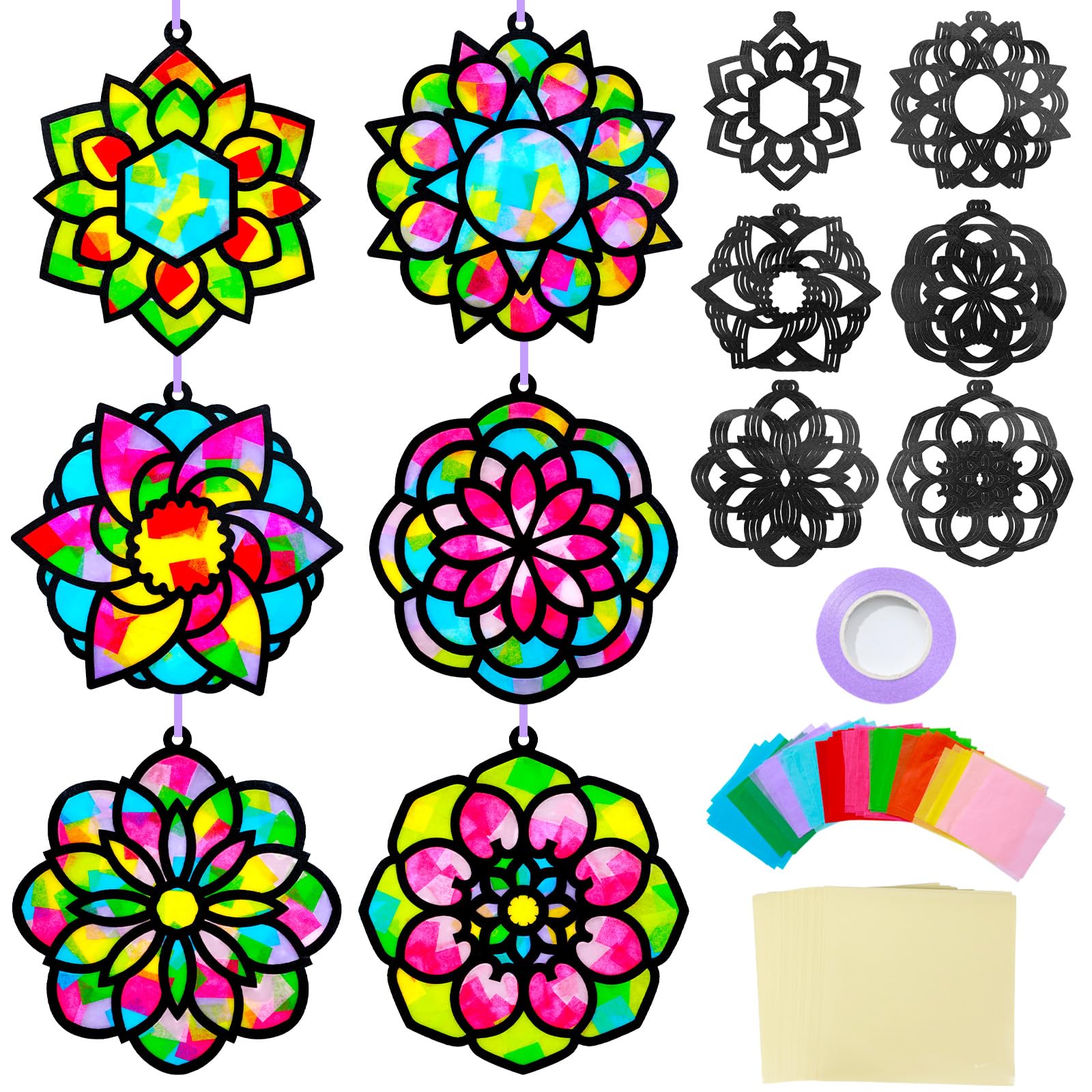 Qyeahkj 36 Set Mandala Tissue Paper Crafts for Kids DIY Mandala Window Suncatcher Craft Kit Hanging Decor Ornament for Summer School Home Activity Art Project Birthday Party Favors Gifts