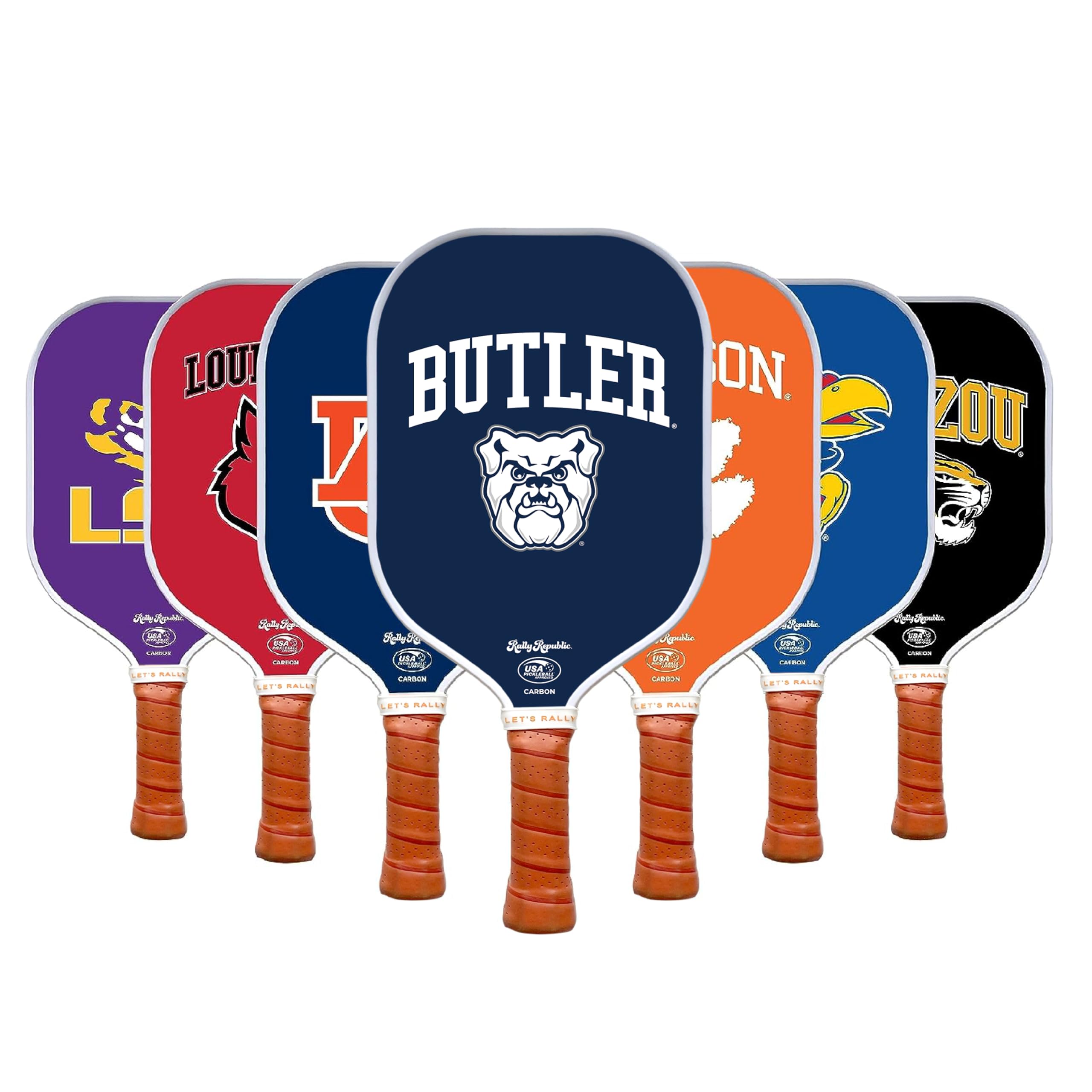 USA PICKLEBALL ASSOCIATION APPROVED: Enjoy unmatched quality and performance on the court with this Rally Republic pickleball paddle. Compliant with all standard rules and regulations, our premium paddles are USA Pickleball Association approved for tournament play. For players of all skill levels. BUTLER BULLDOGS x RALLY REPUBLIC COLLABORATION: Introducing the Midnight Blue Pickleball Paddle with a Bulldog Head print, a product of the exciting collaboration between Rally Republic and Butler University. The Midnight Blue Pickleball Paddle with a Bulldog Head print is a limited edition product that is designed to reflect the spirit and energy of the Butler Bulldogs. LIGHTWEIGHT & LONG LASTING PREMIUM PADDLES: This paddle features a tight honeycomb core interior and a UV printed carbon fiber surface. At just 8.0 ounces, it is exceptionally lightweight and helps reduce fatigue and enhance your gameplay so that you can maintain your winning form on the court. UPGRADE YOUR PICKLEBALL GAME: This pickleball paddle is designed for enjoyment and features a large paddle face (width of 7.8 inches, including the edgeguard), designed to give players a more prominent sweet spot for a competitive advantage. With an overall length of approximately 15.75", this pickleball paddle is perfect for both beginners and seasoned players, striking the optimal balance of power and control. PLAY WITH COMFORT: This Rally Republic indoor/outdoor game paddle is the perfect choice for players who demand maximum comfort and control on the court. Featuring a premium, hand-wrapped leather grip with an EVA foam contoured cushion, the same sweatproof condensed foam grip used in the tennis and golf industry, this pickleball racket provides a comfortable and secure grip for extended gameplay and endless fun for all lovers of the sport of pickleball. OFFICIALLY LICENSED - APPROVED & CERTIFIED BY MAJOR BRANDS: Our Butler Bulldogs pickleball paddles are officially licensed products that have been approved & certified by Butler Bulldogs ensuring that they meet the highest equipment standards of quality & design. With our pickleball paddles, you can be confident that you are getting a reliable & top-performing paddle for your next game. Additionally, they make for a fun gift whether it's for Christmas, graduation, or a birthday. Experience superior quality and performance on the court with Rally Republic pickleball paddles. These rackets for outdoor adult games are an excellent choice for players of all skill levels and have received approval from the USA Pickleball Association. Moreover, the pickle paddle’s Lightweight Carbon Fiber Honeycomb core enhances gameplay and allows longer game time. It is incredibly lightweight, weighing only 8.0 ounces, which reduces fatigue and helps you win the match. ENHANCE YOUR PICKLEBALL PERFORMANCE Take your pickleball game to the next level with our pickle ball rackets, offering a large paddle face (width of 7.8 inches, including the edgeguard), designed to give players a more prominent sweet spot for a competitive advantage. This adult outdoor games racket is approximately 15.75" long and is perfect for players looking to improve their game. Moreover, It features a premium, hand-wrapped leather grip with an EVA foam contoured cushion that provides maximum comfort and control on the court. This pickleball racket ensures a comfortable and secure grip during extended gameplay, keeping you at the top of your game. THE GUARANTEED CHOICE Rally Republic pro pickleball paddles are certified and approved by major brands and colleges, guaranteeing a high-quality product that meets the highest standards of quality and design. With this assurance, you can be confident that you are getting a reliable and top-performing paddle for your next game.