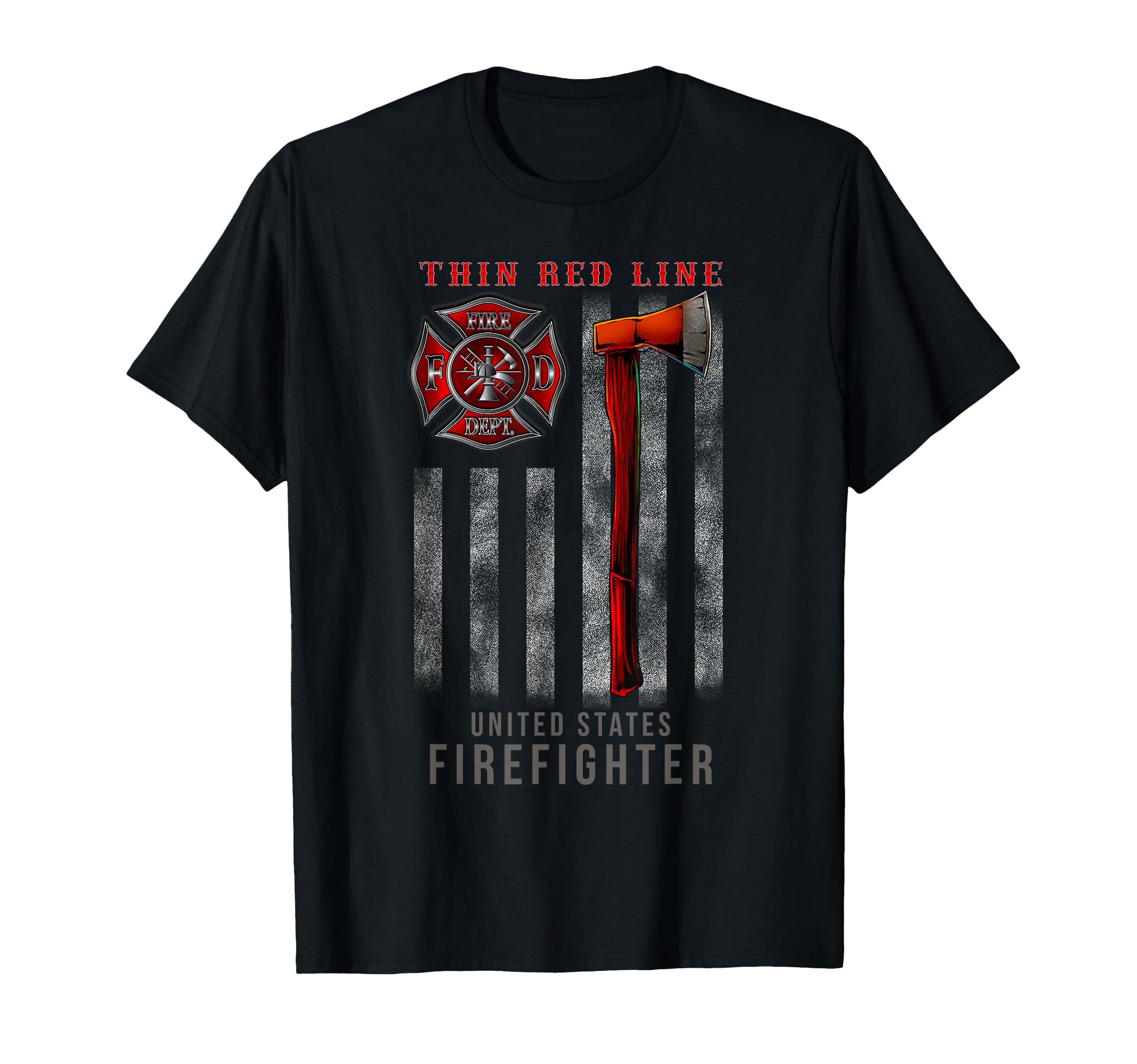 Firefighter Patriotic Design design. A Fire Department Maltese Cross emblem and a firefighter's axe a set against a distressed American flag background. The red axe handle represents the red thin line, in honour of firemen. Click Add to Cart to buy this 911 tribute gift for firemen for your firehouse, station, ladder company or fire department. Wear it to show your patriotic pride as a first responder. Lightweight, Classic fit, Double-needle sleeve and bottom hem