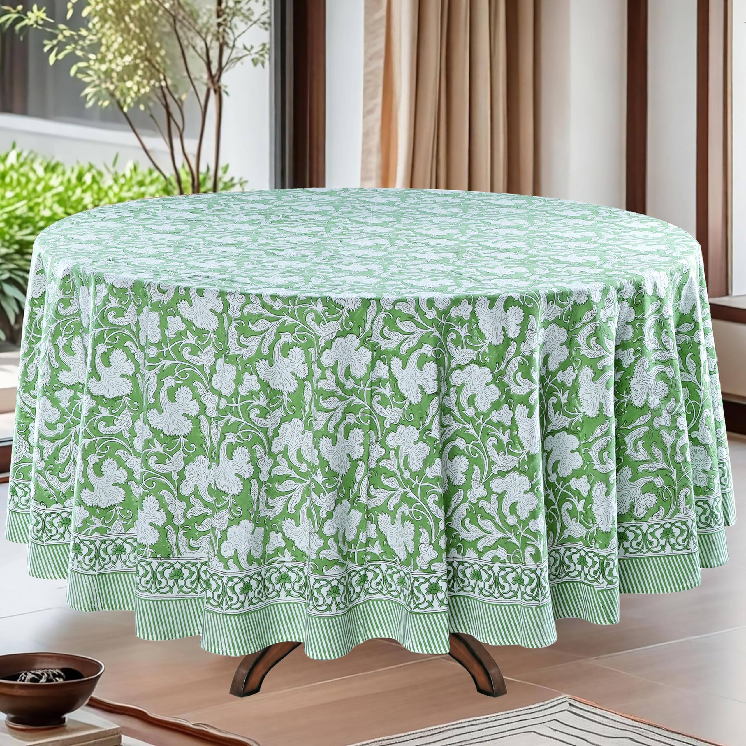 Premium Handcrafted Tablecloth: This Round tablecloth is designed to add an elegant touch to your dining or coffee table. Carefully crafted with attention to detail, it showcases signature blend of tradition and quality. Authentic Indian Hand Block Print Art: Created using traditional Indian hand block printing techniques, each tablecloth reflects centuries-old craftsmanship passed down through artisan communities, making every piece truly one of a kind. Perfect for Everyday & Festive Use: Ideal for daily use, special occasions and seasonal gatherings — whether you're hosting a brunch, setting a fall-themed table, or decorating for Thanksgiving, Halloween, or Christmas. Easy Care & Reusable: Made from soft, breathable cotton, this tablecloth is reusable and designed for long-term use. Gentle hand wash or machine wash on delicate with mild detergent is recommended. Air dry to preserve the print and texture. Thoughtful Gifting for Every Occasion: A beautiful and practical gift for housewarmings, Thanksgiving dinners, Fall get-togethers, Christmas celebrations, or even a host gift Make a bold style statement with the Ridhi Floral Hand Block Print Cotton Table Cover in Sage Green. This 132 Inch Round tablecloth is expertly handcrafted using traditional block printing techniques, featuring an elegant floral pattern that adds warmth, charm, and sophistication to your dining space. Made from premium quality, washable cotton, this tablecloth is soft, durable, reusable, and easy to care for. It’s the perfect fit for extra-large dining tables, kitchens, birthday parties, weddings, Christmas, Thanksgiving, and both indoor and outdoor events. Whether for everyday dining or festive gatherings, this versatile tablecloth is sure to impress.