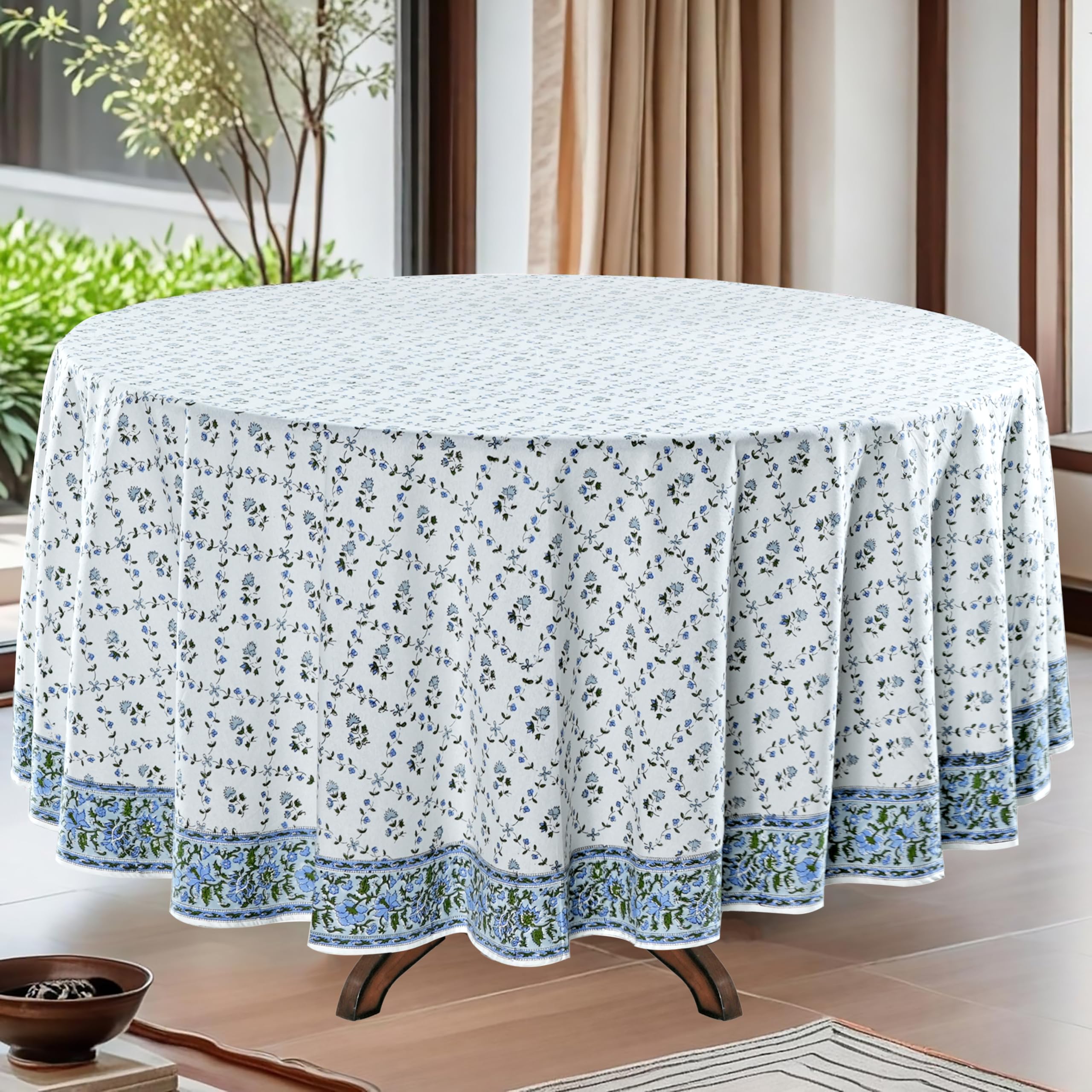 Ridhi Round Tablecloth - Hand Block Print 100% Cotton Reusable Powder Blue 60 Inch Table Cover Decorative Use for Dining, Home, Party, Wedding,