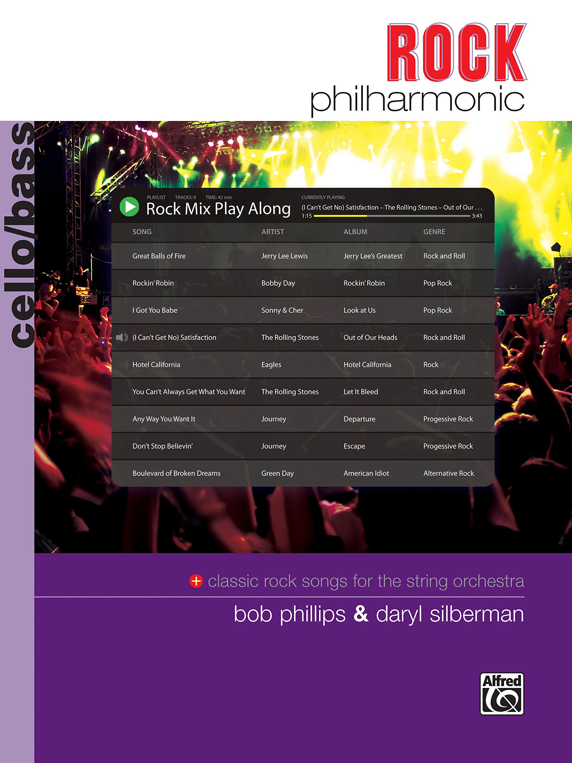 This collection of nine classic" Rock tunes spans five decades of rock history. The arrangements in Rock Philharmonic contain complete versions and lead sheets of original hit songs by top groups and artists: Jerry Lee Lewis, Bobby Day, Sonny and Cher, The Rolling Stones, The Eagles, Journey, and Green Day. Each piece includes a flexible arrangement that allows the melody, harmony, and bass parts to be played by all sections in the string orchestra, like or mixed instrument groups, quartets, or trios---allowing players to learn the component parts of rock and roll, play the classic arrangement, create their own arrangements, or perform the tunes solo. In addition to string orchestra, the arrangements are also set for electric strings with optional guitar/electric guitar, piano, and drumset. The student book contains a full-length, two-page play thru version of the melody, which follows closely the original recording and includes clearly labeled Intro, Verse, Chorus, Bridge, and Outro sections. The bass and harmony component parts are then presented in a lead sheet format, along with a flow chart that matches the order of the Melody Line Play Thru. The teacher's book contains a full score and reproducible piano and percussion parts. Guitar chords appear in all parts. For easy practice, the accompanying CD has two tracks for each piece---a complete track and a backing track---and TNT 2 software to mix the level of each instrument, change pitch, change tempo, and create loops. The CD can also serve as an aid to learning by ear. Titles: Great Balls of Fire * Rockin' Robin * I Got You Babe * (I Can't Get No) Satisfaction * Hotel California * Any Way You Want It * Don't Stop Believin' * Boulevard of Broken Dreams * You Can't Always Get What You Want."