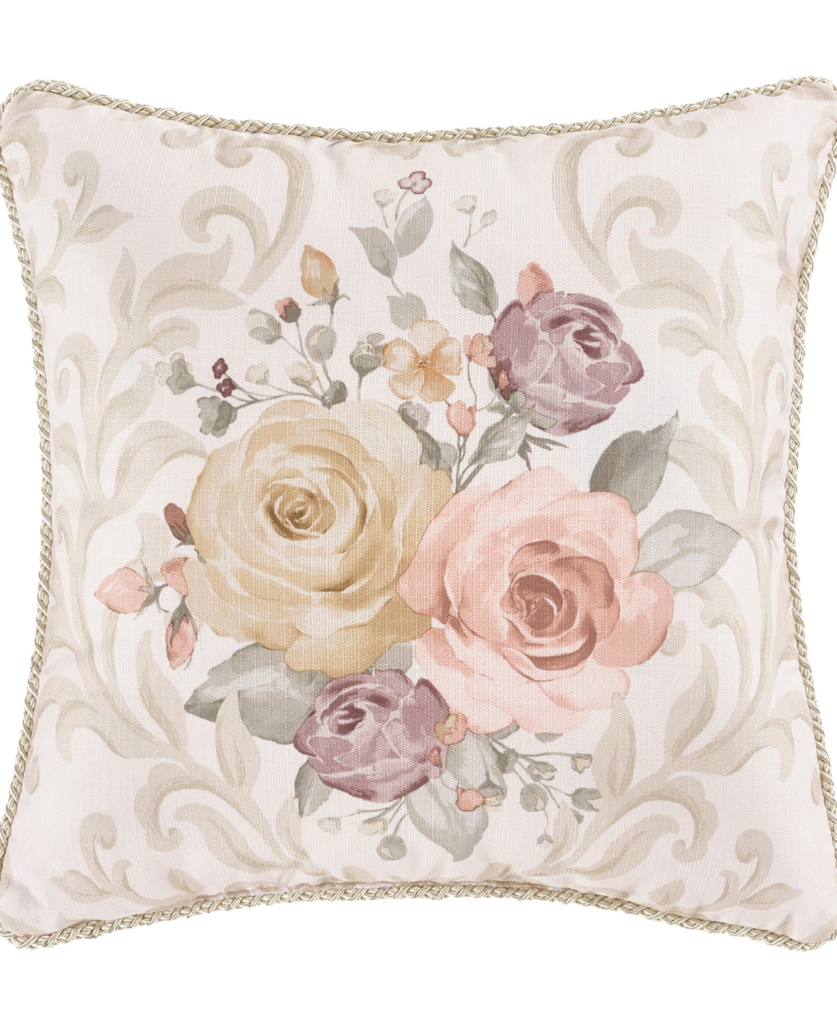 The 16" square decorative pillow is a classic floral pattern in beautiful blush, lavender and gold tone colors which are enhanced by ivory tones. This classic accent pillow is adorned with twisted cord around all sides. Add the Chardonnay comforter set or quilt set to complete the classy chic look.