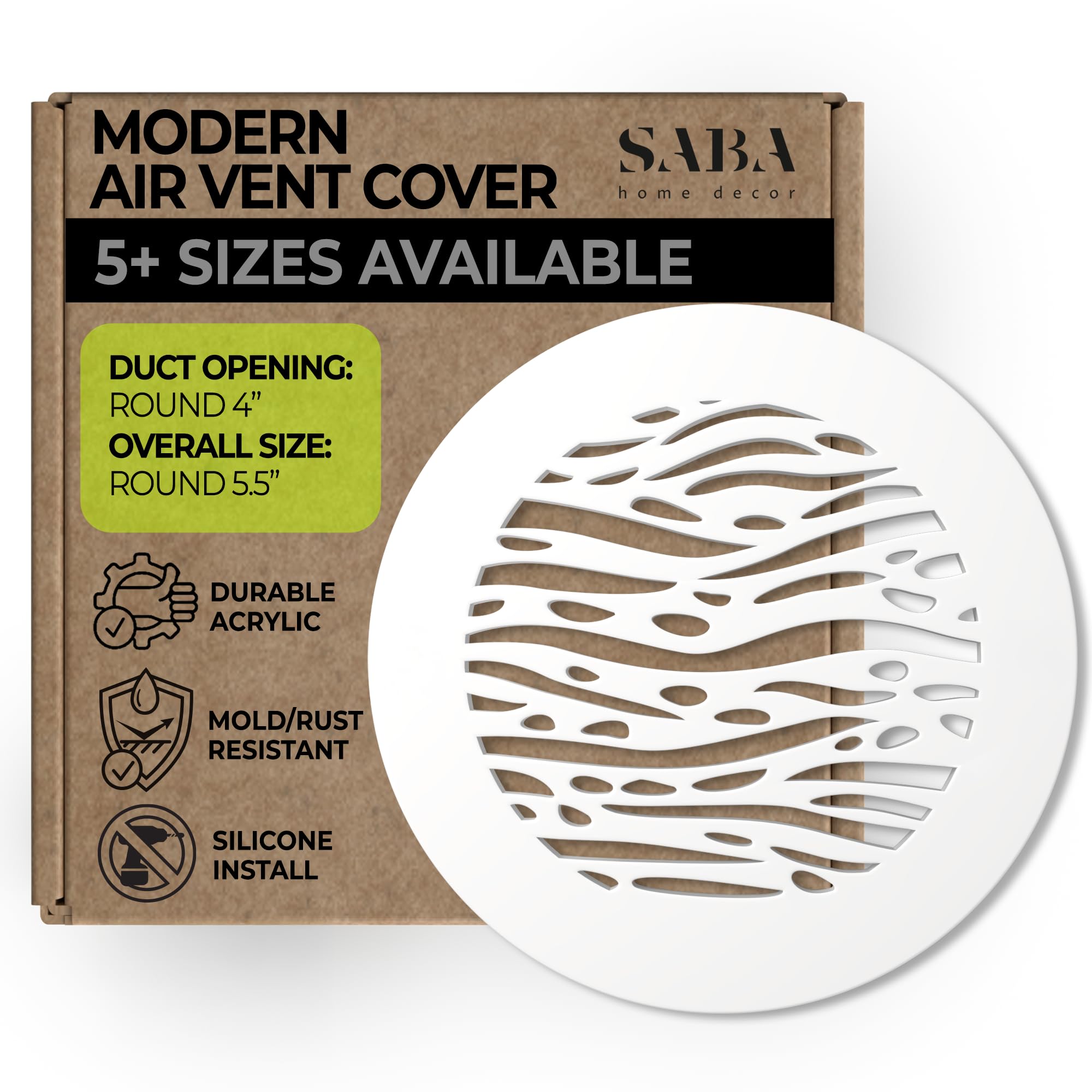 MATERIAL: We use high quality acrylic fiberglass material (Grade A+) which is moisture and heat resistant suitable to cover air vents, ducts or openings all around your house, apartment or office space. The vent covers are manufactured in the USA using high precision laser cut machine allowing us to cut to any shape or size to meet our customers’ needs MEASUREMENTS: Please order by the opening size. Listed product sizes refer to the duct opening measurements, outer dimensions in most cases are 1" in each direction. The thickness of the material is 3/16". The back of this grille is flat with no protrusion which makes it very easy to attach to the wall or ceiling without any scratches or sides of the cover hanging around. USE: These vent covers are perfect for walls and ceilings, not for floor use. SABA Home Decor offers a luxurious solution to unattractive, stamped-metal grilles and air vent covers that have always been a challenge for modern interior designers. INSTALLATION: the instructions are very easy and fast. You can visit our separate page on the website for more details. The installation requires only self adhesive silicone so you can attach the product to the wall or ceiling, no screws or any other hard work is required. On top of that it is maintenance free after installation as no corrosion, rust or mold will be formed on this material. SABA Home Decor offers a luxurious solution to unattractive, stamped-metal grilles and air vent covers that have always been a challenge for modern interior designers. Now you have a chance to replace them with our beautiful and high-quality white finish air grilles made from acrylic plexiglass (Grade A+). The vent covers are manufactured in the USA using high precision laser cut machine allowing us to cut to any shape or size to meet our customers’ needs. Every home needs an elegant upgrade to add some character and upscale look, and we at Saba Home Décor came up with the perfect solution for this.