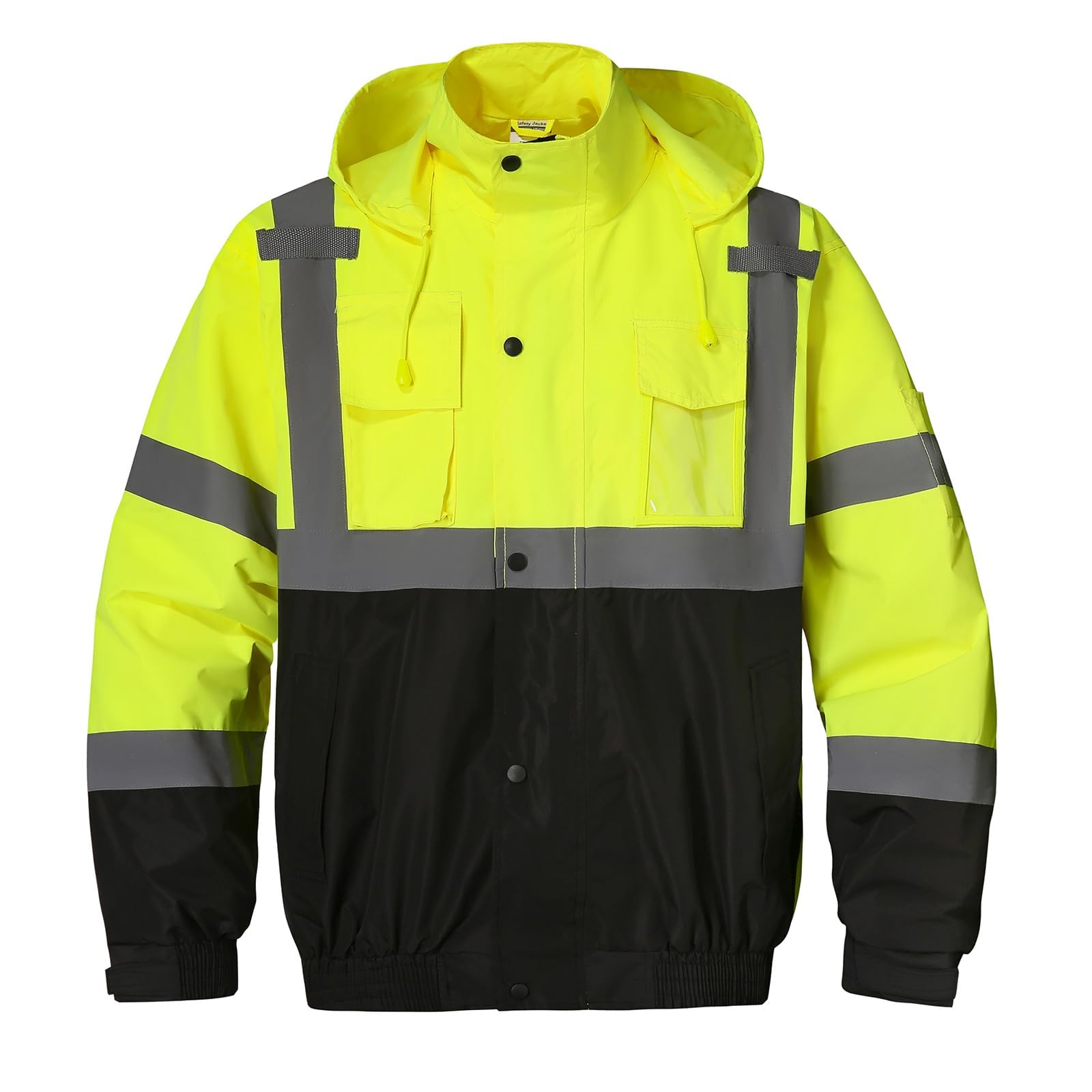 【Full protection】SKSAFETY Safety Softshell Jacket fully complies with ANSI/ISEA 107-2020 Class 2 Type R Standard. 【waterproof index of 5000mm】: 260T polyester with TPU laminated outer shell, Comfort and waterproofing at the same time. 【2" Reflective strips】 2" heat transfer reflective tapes cover the chests, shoulders, waist and back in our reflective shirts to provide 360°protection. 【Functional part】1 removable hood, 1 inner chest pocket, 2 lower slant pockets, 2 mic tabs, 1 cell phone pocket, 1 clear ID holder, and 2 pen holder pockets on sleeves. 【SIZE】: Please refer to the size chart before purchasing safety jackets for men, which includes chest and length data. If you like a loose fit or measure between two sizes, take one or two sizes up. Because the size is measured manually, please allow a certain error Safety Rain Jacket, Professional level Class 3 High Visibility Rain Coat for Men, Hi Vis Rain Suits with Zipper Waterproof