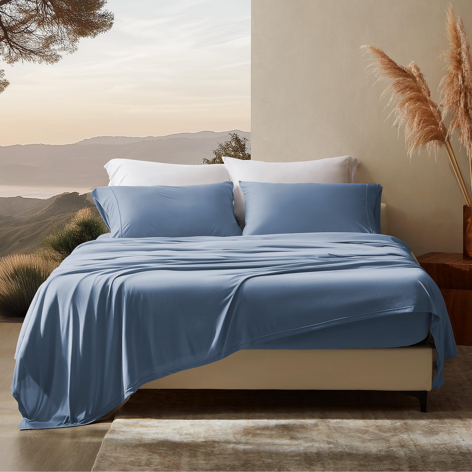 JERSEY KNIT - Our Jersey Knit sheet set is exceptionally soft and elastic. Thanks to our unique brushing technique, sleeping on them feels like being surrounded by a cloud. Jersey knit bedding also boasts a good moisture-wicking feature, helping you maintain a comfortable sleep temperature all night. PILLING RESISTANT & DRAPE - Crafted with advanced technology, our bedding effectively resists pilling compared to other ordinary fabrics. Its exceptional drape allows it to conform to the body's curves in 360 degrees, providing better body coverage. MADE IN GREEN - OEKO-TEX MADE IN GREEN products are tested for harmful substances and made in safer workplaces with reduced environmental impacts. Blend of technique and elegance, our linens are designed to offer you a unique and sophisticated sleeping experience. Shrink and wrinkle resistant. 4 PIECE BED SHEET SET - King size 4-piece bed sheets set, including 1 flat sheet measuring 102 by 108 inches, 1 fitted sheet measuring 78 by 80 inches and 2 pillowcases measuring 20 by 40 inches. CARE INSTRUCTIONS - Machine wash in warm water on a gentle cycle, tumble dry on low heat or air dry. Do not iron or dry clean. Avoid bleaching. Sleep Zone Bedding Jersey Knit King Bed Sheets Set, 4 Pieces Bedding, Brush Microfiber, Soft and Breathable with Flat Sheet, Fitted Sheet, Pillow Case, Deep Pocket (Stone Blue, King)