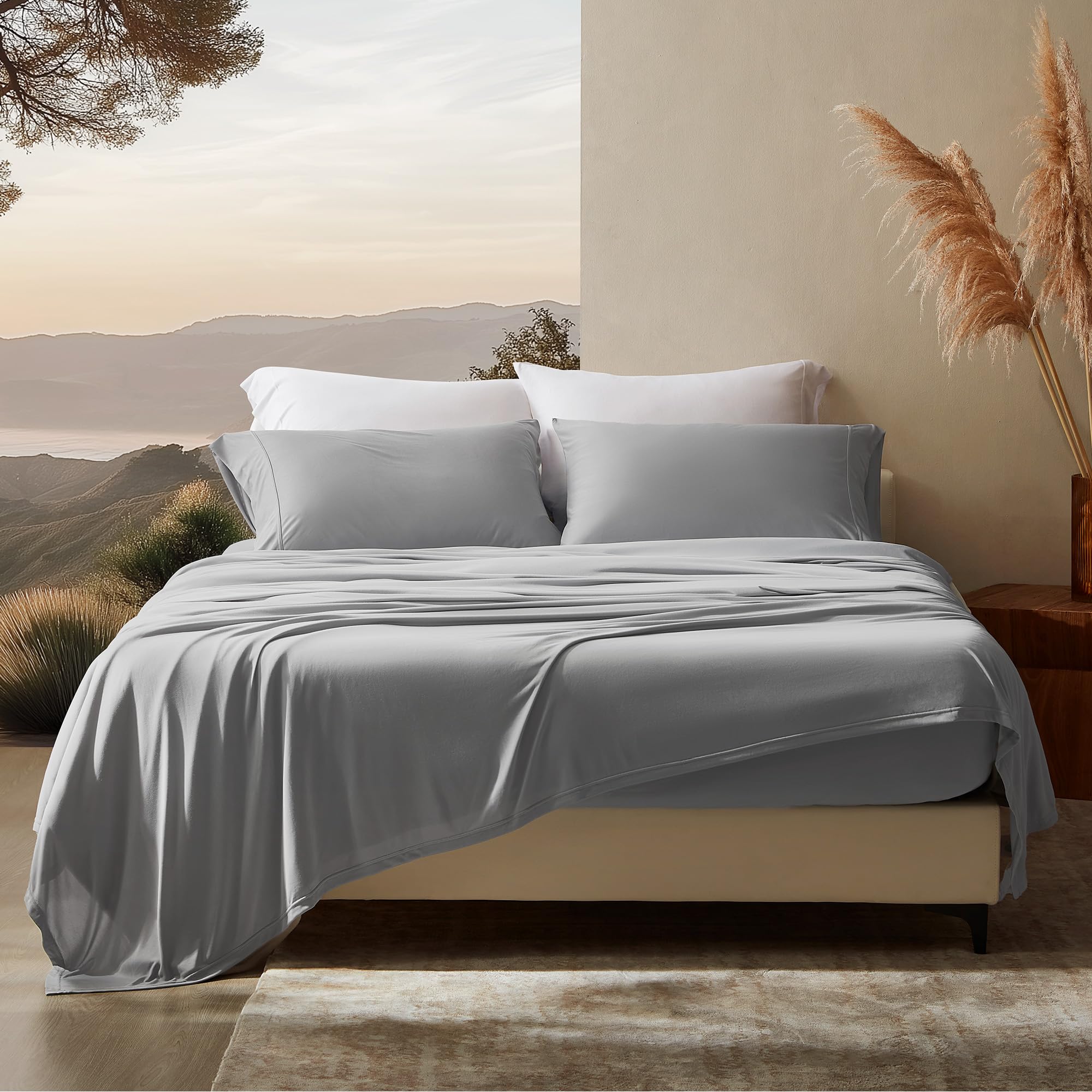 JERSEY KNIT - Our Jersey Knit sheet set is exceptionally soft and elastic. Thanks to our unique brushing technique, sleeping on them feels like being surrounded by a cloud. Jersey knit bedding also boasts a good moisture-wicking feature, helping you maintain a comfortable sleep temperature all night. PILLING RESISTANT & DRAPE - Crafted with advanced technology, our bedding effectively resists pilling compared to other ordinary fabrics. Its exceptional drape allows it to conform to the body's curves in 360 degrees, providing better body coverage. MADE IN GREEN - OEKO-TEX MADE IN GREEN products are tested for harmful substances and made in safer workplaces with reduced environmental impacts. Blend of technique and elegance, our linens are designed to offer you a unique and sophisticated sleeping experience. Shrink and wrinkle resistant. 4 PIECE BED SHEET SET - 1 Flat Sheet 102x90 inch, 1 Fitted Sheet 80x60 inch, 2 Pillow Case 20x30 inch. CARE INSTRUCTIONS - Machine wash in warm water on a gentle cycle, tumble dry on low heat or air dry. Do not iron or dry clean. Avoid bleaching. Sleep Zone 100% Microfiber Jersey Knit Sheet Set, 4 PC Comfy Breathable & Cooling Sheets, Hotel Luxury Bed Sheet for Adults, Soft and Skin Friendly (Gull Grey, Queen)