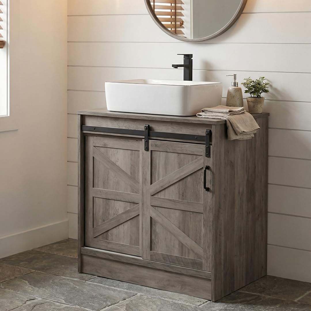 【Product Details】The Bathroom Vanity is made of MDF wood. Self-assembly needed. Shipped in TWO packages and the arrival time may be different. Packages include the Bathroom Vanity, sink, faucet, pop-up drain, hot/ cold lines, and mounting hardware. Bathroom Vanity size: 19"x 30"x31.5" (D×W×H); Sink dimension: 21.7" L x 13.4'' W x 5.9'' H; Bowl thickness: 0.5". 【Unique Sliding Barn Door】The innovative and unique use of a barn door brings our Bathroom Vanity close to real farm life. The smooth black rail not only makes the storage space easy to access but also adds a touch of style. 【Farmhouse Lifestyle】This Bathroom Vanity is inspired by the farmhouse style and we wish to bring it as a lifestyle to everyone with our artistic design. The Bathroom Vanity chooses a brownish-gray color and barn door design in hopes of making every customer feel chic, comfy, cozy, and warm. 【Multiple Choice of Sink】The Bathroom Vanity can be paired with a wide variety of styles of sink. Our Bathroom Vanity can meet different needs of different people. No matter what style your bathroom is, you can find your favorite Bathroom Vanity Set here. 【Large Storage Space】This Bathroom Vanity has a huge amount of interior storage space. Built-in dividers allow our Bathroom Vanity to better and more neatly organize a range of bathrooms. Bathroom Vanity