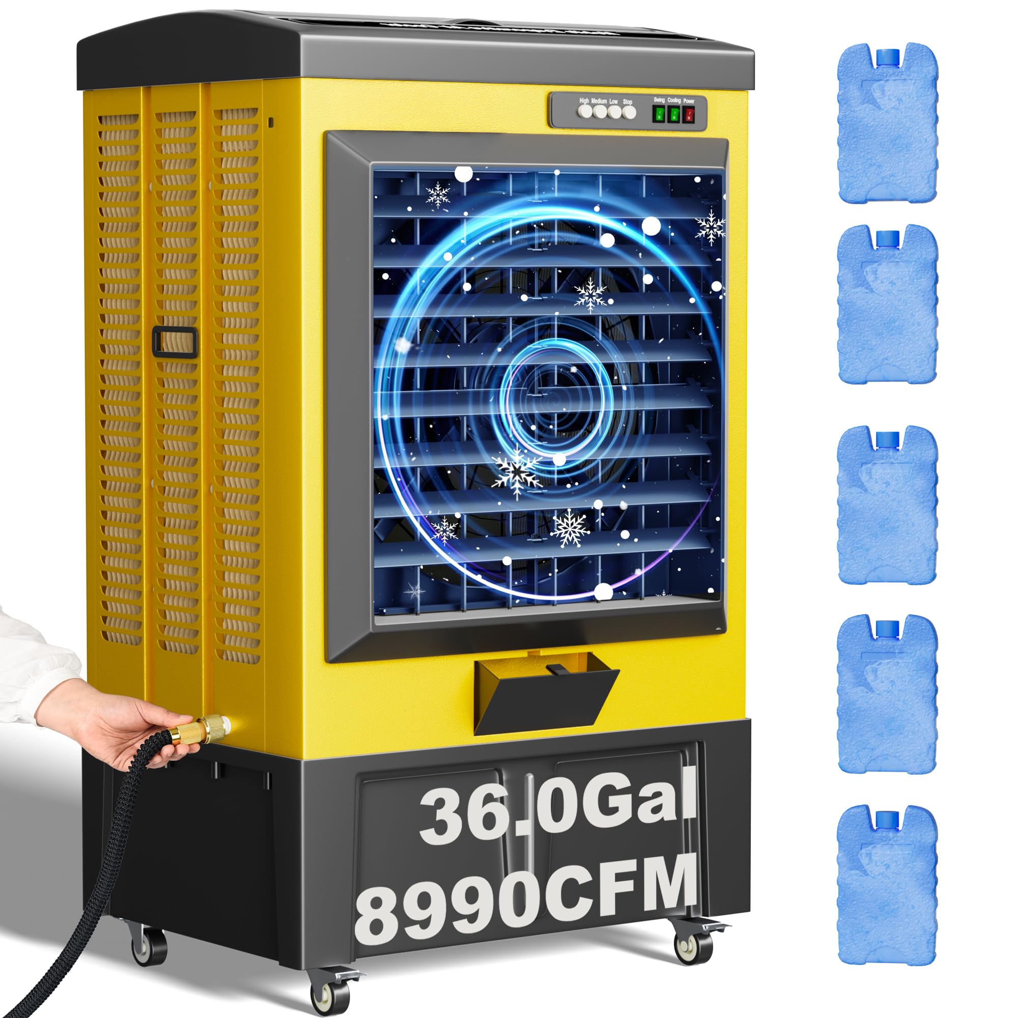 Powerful & Energy-Efficient– Instant Cooling for Large Spaces! Beat the heat effortlessly with the heavy duty swamp cooler, designed to deliver powerful airflow (up to 6500 Cubic Feet per Minute) and ultra-energy-efficient (only 660W,which saves 90% energy vs. traditional AC.)! Perfect for both indoor & outdoor use.This cooler rapidly lowers temperatures by 25-30°F especially in dry climates, transforming spaces up to 1500-2000 sq.ft. into refreshing oases 36 Gal XL Water Tank – Hydrate for Hours with Zero Hassle! Enjoy uninterrupted cooling with the massive tank, delivering 6-10 hours of continuous runtime on a single fill! It offers versatile refilling options:Top-Fill Wide Opening with no bending required! Effortlessly pour water into the spacious top tray, ideal for seniors and expectant mothers.Or connect to a standard hose for continuous refilling.The clear viewing window lets you monitor usage.Plus,the leak-proof,thickened tank is crafted with seamless,heavy-duty materials to prevent cracks,even in high-motion outdoor settings 120°Oscillating – Precision Cooling Where You Need It! Maximize comfort with 120° oscillation that evenly distributes cool air across wide areas, eliminating hot spots,covering every corner of your patio,garage,or living room for consistent cooling. Pair it with manual 60° vertical tilt adjustment to direct airflow upward or downward—perfect for avoiding direct drafts or targeting specific zones.Wider coverage means faster cooling with less power Premium Build, Industrial Strength – Engineered to Last for Years! Crafted for uncompromising durability, this swamp cooler boasts a heavy-duty all-metal construction with rust-resistant galvanized steel that withstand harsh weather, impacts, and daily wear. At its core lies a high-efficiency copper motor—famous for superior heat resistance, quiet power, and a lifespan 2x longer than Aluminum motors.4 heavy-duty casters – two lockable wheels with brakes ensure stable positioning on uneven surfaces, while all-terrain rubber wheels glide smoothly across concrete, grass, or decks Effortless Maintenance – Clean in Minutes, Enjoy for Years! This swamp cooler features a user-friendly design that makes cleaning a breeze. The removable rear cover grants instant access to 3-sides reusable cooling pads, which can be easily pulled out, rinsed, and reinstalled for endless cooling.Safety First! – Always unplug the unit before cleaning to ensure safe operation