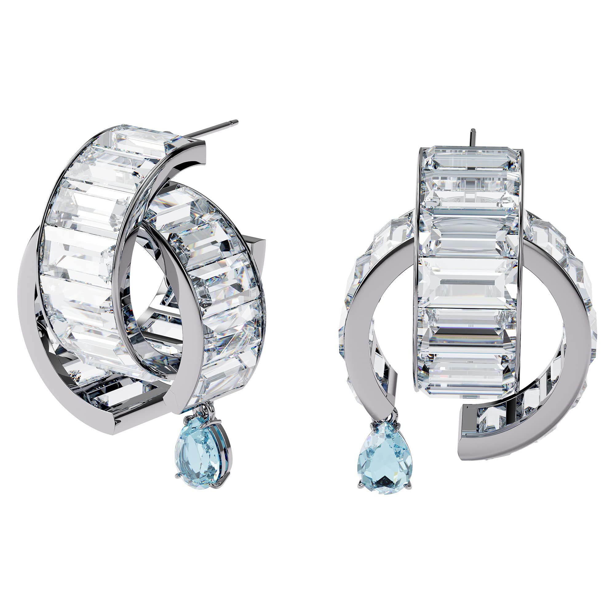 Measurements: Product length 1 inch, width 1 inch Simple and timeless: This elegant pair of earrings combines precision and quality of sparkling Swarovski crystals with a fresh touch of color, thanks to a delicate light blue teardrop crystal element Classic and stylish: Drawing inspiration from the double helix structure of DNA, these Matrix earrings feature 2 intersecting curved rows of white crystals that catch light from every angle Designed to last: Swarovski jewelry maintains its brilliance when simple care practices are observed; remove before contact with water, lotions or perfumes and polish with a lint-free cloth Great for giving: These stunning earrings add a timeless sparkle to your everyday style or on more formal occasions; give them as a gift to someone special or add them to your own jewelry collection Items delivered: (1) pair of Swarovski Matrix pierced earrings, with sparkling white and blue dangling crystals on a rhodium plated setting, complete with a Swarovski earring box