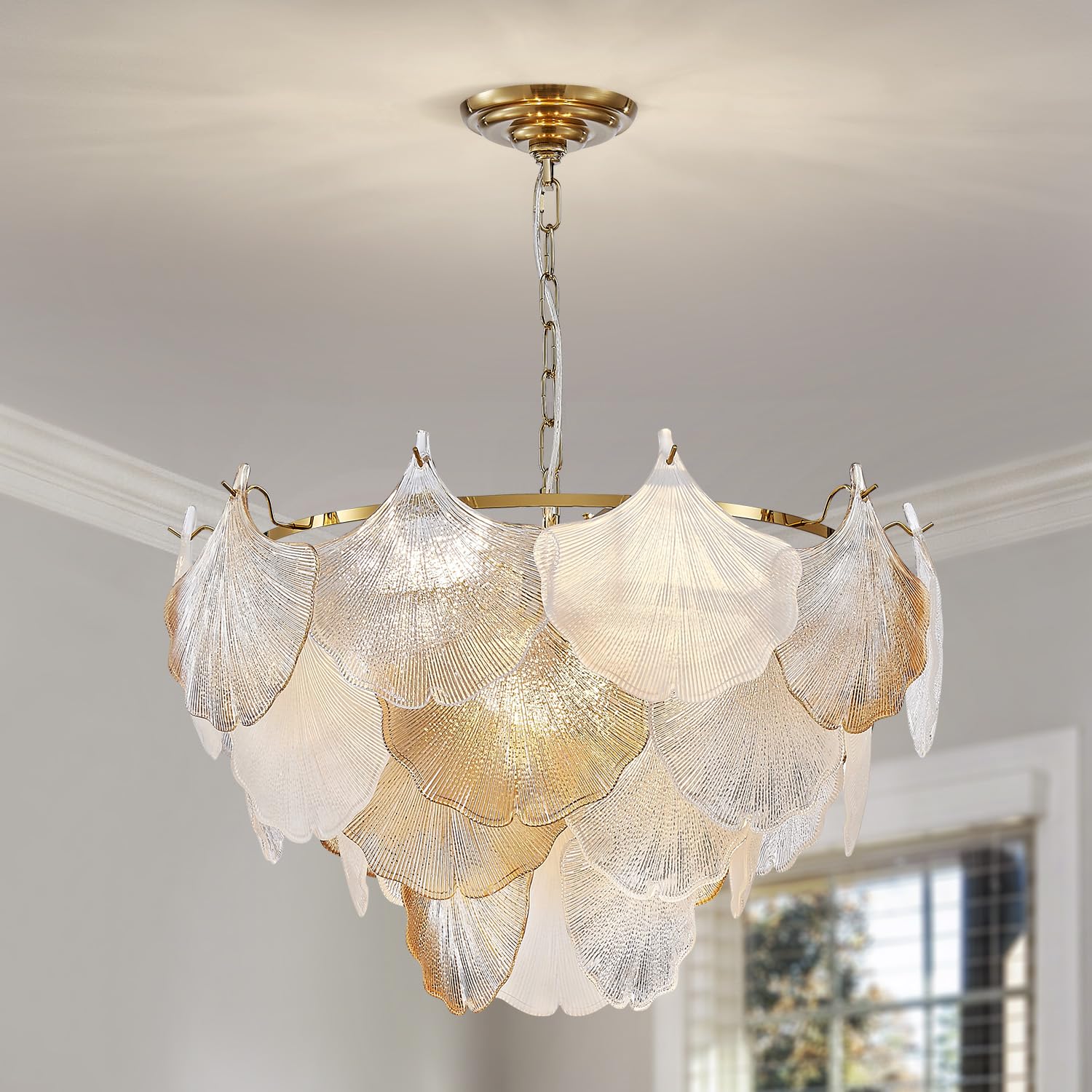 【Design and Style】 This chandelier exudes a captivating blend of elegance and opulence. Its defining feature is the exquisite glass lampshades fashioned in the graceful silhouette of maple leaves. These uniquely shaped glass shades, reminiscent of delicate maple foliage, lend a distinctive and sophisticated charm to the entire piece. 【Specifications】 D24" x H15", adjustable chains 59"; 9 x E12 bulb socket, please note that bulbs are not included with this product. 【Materials】The chandelier is made of high-quality materials, including glass and metal. The glass shades are crafted with precision and care, embodies a flawless blend of durability and sophistication, while the metal arms provide sturdiness and durability. 【Versatility】 This crystal chandelier is versatile and can be used in a variety of settings, including living rooms, dining rooms, bedrooms, and even hallways. Its elegant design and exquisite craftsmanship make it a perfect choice for any decor style. 【Installation】 The crystal chandelier is easy to install, and it comes with all the necessary hardware for installation. The adjustable chain length allows for flexibility in hanging height, making it easy to customize for any space. Saint Mossi Modern Chandeliers for Dining Room, Pendant Light Fixture for Living Room, Ripple White & Champagne Ginkgo Leaf Glass Shades, Gold Finish Metal Frame Glass Shades