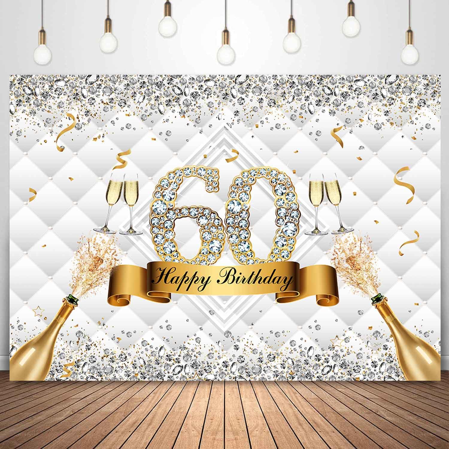 【Specific Details】 1PC 7×5ft (width×height), thin vinyl, durable, no reflection and lightweight, vivid and vibrant colors, High-resolution digital print, non-toxic, touched safety. Pole pocket or clips Not Included. 【Usage】Hang the backdrop to the stand with clips, OR tape or nails the backdrop on the wall. Very convenient to use and save your time at the party decoration. 【Wide Application】The backdrop can be used as party background, wall decor, cake table banner, celebration, photo studio photography and so on. It can as a photo booth backdrop for you to take photos with your family and friends. Great for 60th birthday party theme and create a joyful party atmosphere for you. 【Make Party Special】This White 60th birthday backdrop has elegant colors and exquisite designs, and give your guests deep impressions. Give a unique glow to your party 【Warm tips】 1--The package only contains one piece backdrop. 2--Not waterproof.Don't touch water. 3--Item sent folded. If necessary, please iron the back surface with steam iron by low heat to reduce creases. Making sure not to leave the iron on any one single spot for too long. WHAT YOU WILL GET: