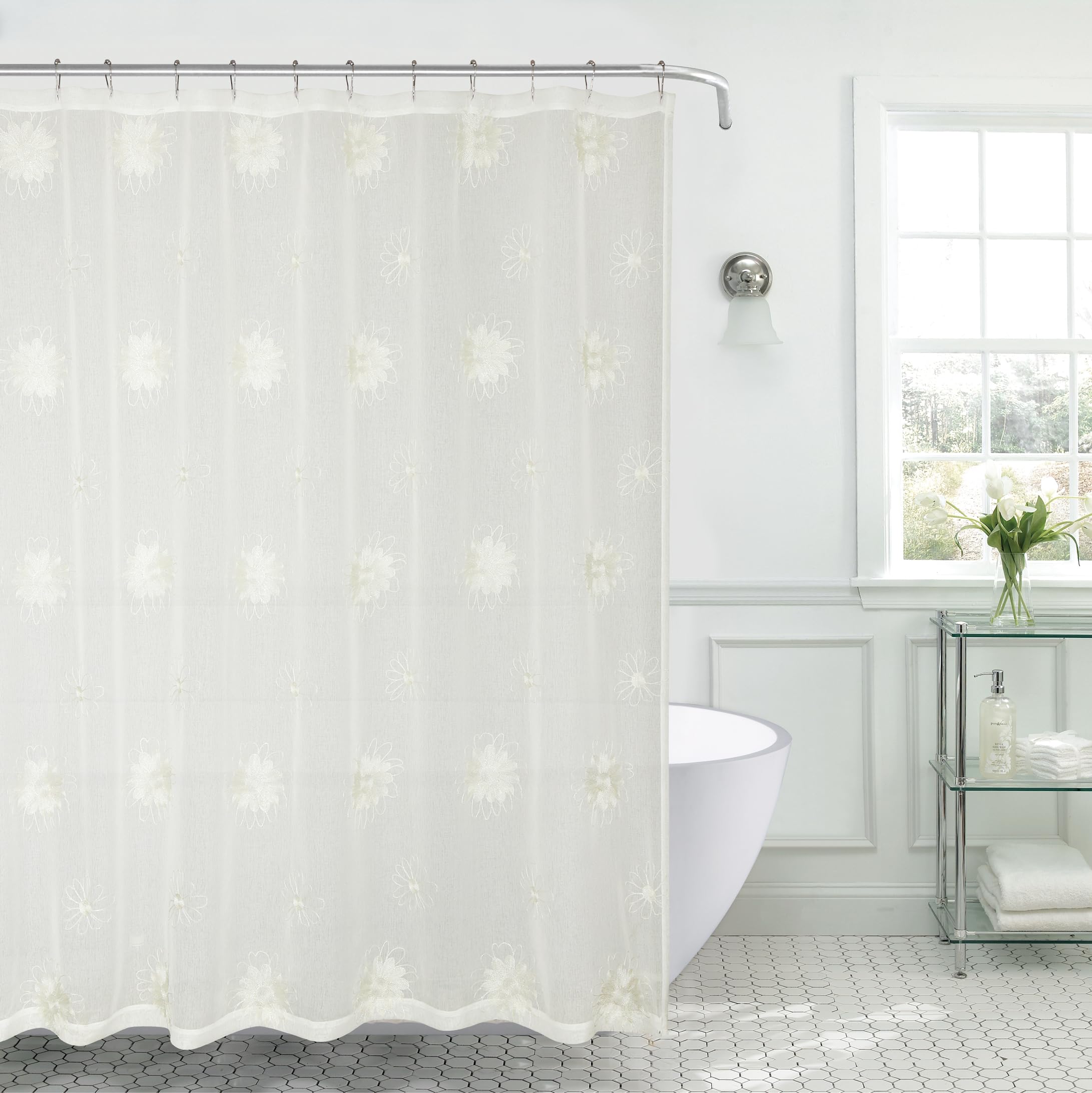 DECORATIVE: a quick and easy way to add a touch of elegance to any room. VERSATILE: Can be used as a bathroom shower curtain or as a decorative window or door decor. EASY CARE: Machine Washable and Dryer Friendly DIMENSIONS: measures 70" width by 72" length Add some sparkle to your life, with this Ivory Creme Beige Fabric shower curtain with a Beige Silver Embroidered Floral Design. Stylish and fun, this curtain is sure to add glamour to your bathroom!