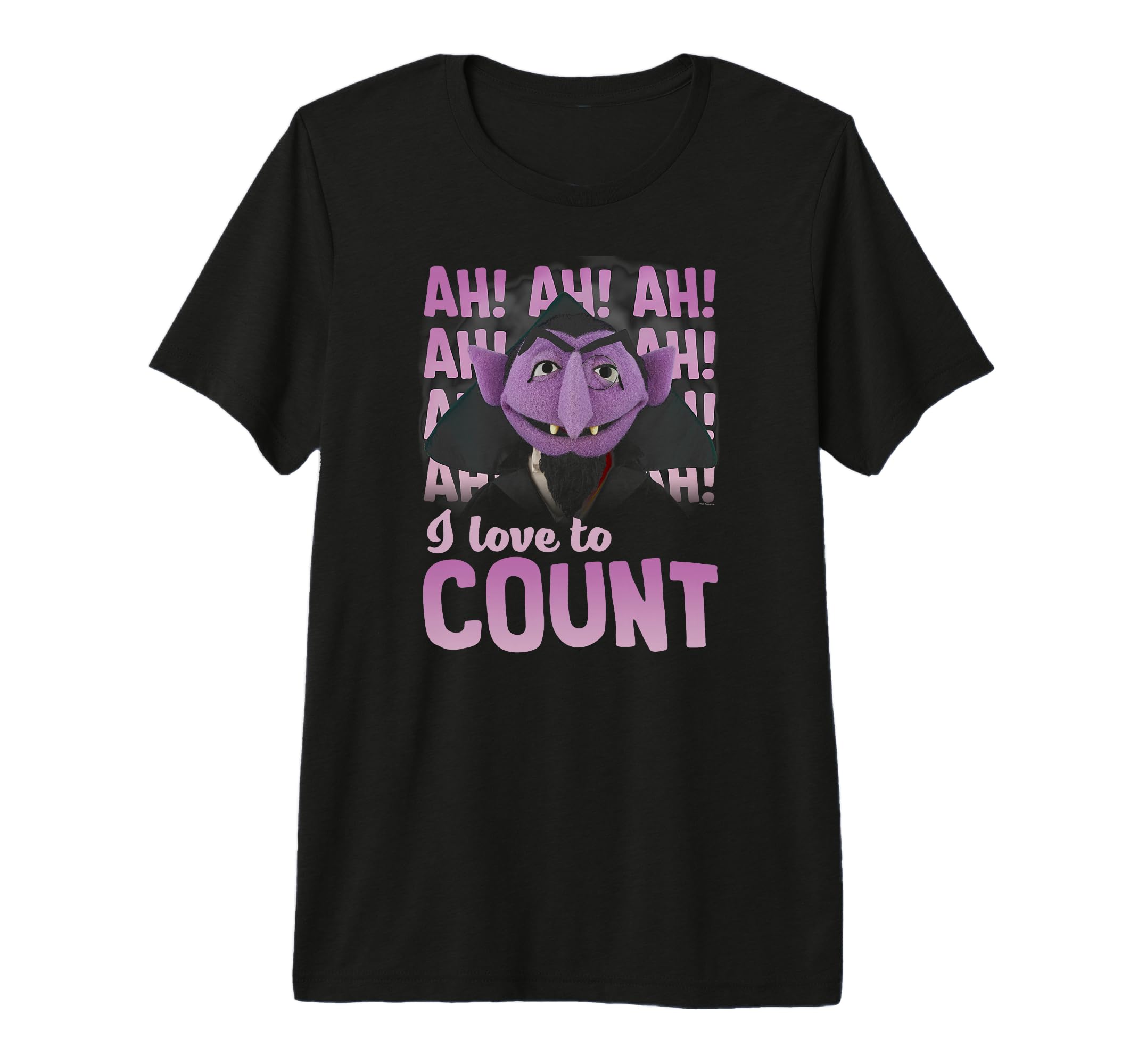 Sesame Street Count Character design. Sesame Street The Count Ah! Ah! Ah! is 100% authentic, officially licensed Sesame Street apparel, that comes in t shirt, v-neck, tank top, longsleeve, pullover hoodie, sweatshirt, styles! Sesame Street is a longtime favorite of children and adults, and a staple of PBS. Big Bird leads a cast of characters such as Bert and Ernie, Oscar the Grouch, Elmo, Grover and many others to teach children numbers, colors and the alphabet. Crafted from a unique 40 singles tri-blend fabric, offering a lightweight, ultra-soft feel Classic crew neck design with side-seam construction ensures both comfort and a flattering silhouette Lighter colors are semi-sheer