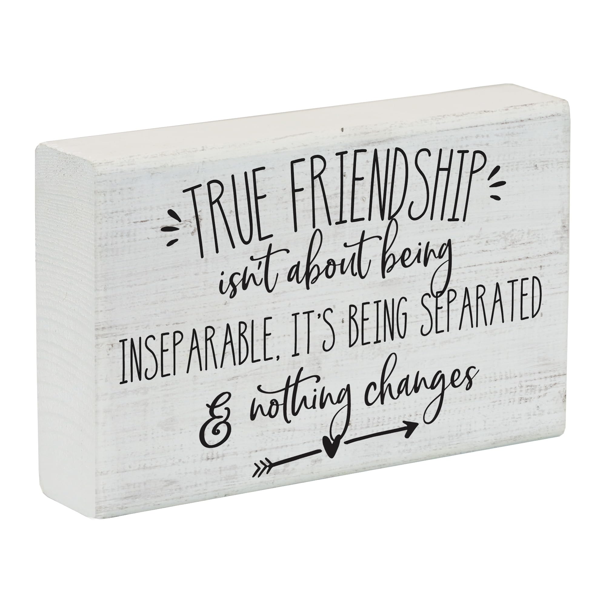 BEST FRIEND GIFTS - Small wood sign reads "True friendship isn't about being inseparable, it's about separated and nothing changes." Beautiful wood sign makes a thoughtful gift for friends near and far. HANDCRAFTED FRIENDSHIP SIGN - Friendship sign is made from solid wood. Small friendship decor will fit in any space and makes great friend gifts for women. BEST FRIEND GIFT IDEAS - Small wooden best friend decor measures 5.25 x 3.50 x 1.25 inches. This beautiful friendship plaque makes a great gift for friends, sentimental gifts for friend, or my best friend sign. EASY TO DISPLAY - Simply Said Small Talk signs are designed to be freestanding, just place on a shelf or table. Wide flat bottom allows you to easily place wood plaque wherever looks best. MADE IN THE USA - Our farmhouse home decor is proudly designed and handcrafted in our small shop in Rock Rapids, Iowa. This Small Talk Rectangle reads "True Friendship Isn't About Being Inseparable, It's Being Separated & Nothing Changes" — A heartfelt message about the strength and resilience of true friendship. Each Small Talk Rectangle is hand made from a real block of 1-inch thick wood, giving it an impressive feel to match its engaging design. The distressed, weathered look creates a homespun décor that is simple yet refined. All of Simply Said’s Small Talk Rectangles are proudly made right here in the United States in our family-owned factory. With over 100 designs, there’s a perfect Small Talk for every personality and any room.