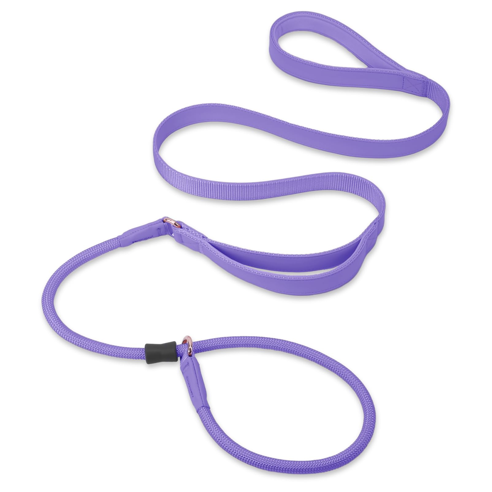 🐾【Soft & Durable Coordinated Materials】- The Dog Slip Lead is made of high-quality Microfibre Leather and Heavy Duty Nylon to make it not only sturdy but also comfortable to use. It is the third generation faux leather which is very Easy to Clean, known for its almost fleece-soft surface with superior durability. Almost 2 times stronger and thicker as compared to the regular Dog Slip Leash. 🐾【Double Handles for Safe Control】- Slip Leads for Dogs features 2 Handles with soft padded to achieve total control. ✅① One handle can be used as a long lead leash, for casual walks, runs, jogs. ✅② The another traffic handle can be used as a short lead leash, use it on busy sidewalks, crowded areas, dogs training class that require emergency up-close control of your dogs. 🐾【Anti-Pull Dog Trainning Lead】- Our Slip Lead Dog Leash is great for no-pull trainning, correcting bad behavior and controlling in a short time. You need to stabilize your arm, the dogs will stop when the lead becomes tightened. Wait for your dogs to slow down and continue. Just slide the adjustable loop over your dog’s heads simply, and use the handle end as a leash. 🐾【Upgraded Premium Hardware】- ✅①Comfort Padded Handle: Soft padding provides a gentler grip and protects your hands. ✅②Non-slip Rubber Stopper: Eliminate rope becoming loose, not only stronger and tighter than leather but also tighten and loosen smoothly. ✅③Rose Gold O-Ring: Customize fit dogs neck size. ✅④Micro-fiber Leather Cover & Tight Suture: High-level appearance and wear-resistant. 🐾【Pick Eye-Catching Set For Your Pets】- 5ft (150cm) Total Length, 0.45"(11mm) Rope Diameter, 1"(2.5cm) Webbing Width. Combination design of Rose Gold Rings and Leather makes it particularly Elegant. High-level appearance of this slip dog leash can instantly catch people's eye and make your dogs stand out from the crowd, get more praise. Perfect for puppy small medium large breeds male or female dogs training, walking or service.