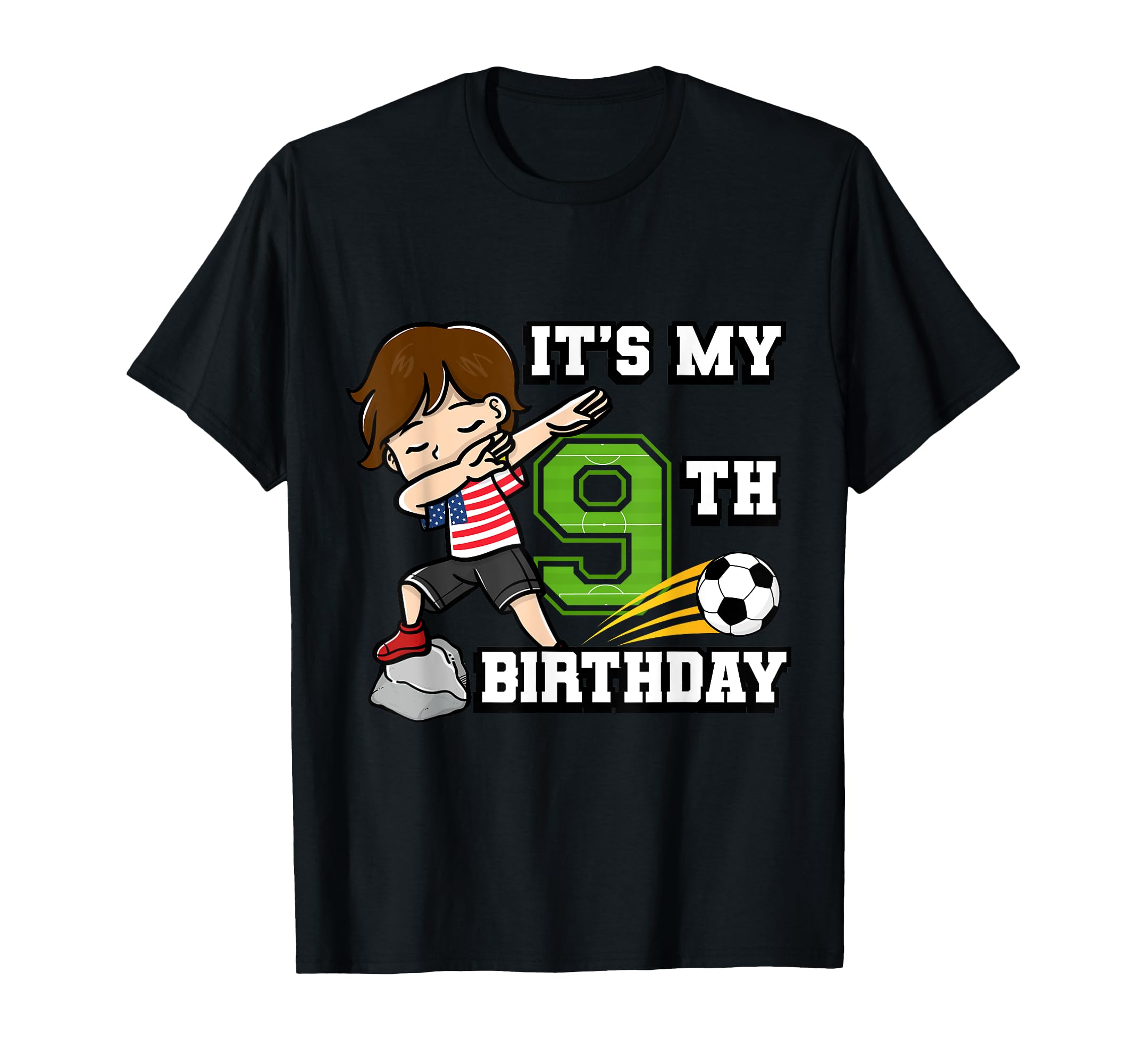 This Boy Soccer Player with the slogan It's My 9th Birthday with American Flag graphic is perfect for young boys or girls, kids birthday celebrants who will celebrate their 9th birthday. If you're a soccer fan or soccer player who will be celebrating 9th birthday party, then this art decor is for you! Cool 9th birthday celebration for kids. Great for anyone who loves playing soccer on a football field kicking a soccer ball. Lightweight, Classic fit, Double-needle sleeve and bottom hem