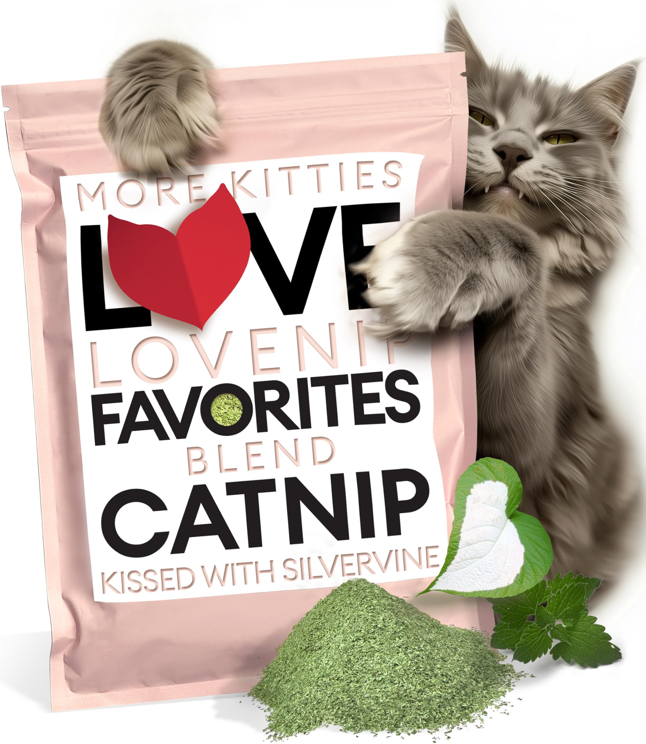 Lovenip Favorites Blend —a shade-dried catnip kissed with silvervine leaf that is loved by more cats than plain catnip. Have a silly, snuggly funfest that brings you closer to your kitty! Grown in Washington and Canada, our "Favorites Blend" combines premium catnip from both regions with silvervine, for purrs, play, and diligent biscuit-making Packed by hand in flat, 3-layer protective packaging, our catnip stays potent until you open it. Flat packaging saves resources and lets us pack more -2.2oz per pack. It's a simple way to show love to your pet and the planet We hand-sift each batch to remove sticks and stems, then cut it to a soft, fine texture—gentle on paws and designed for sprinkling, with more nip per pinch. Ethically-sourced vegan silvervine leaf for the cats we love Cat parents tell us the fine, softcut texture penetrates surfaces better, so cats don't eat it immediately and instead can enjoy the scent for weeks with just one pinch FRESHNESS THAT MAKES THEIR HEART HAPPY Grown without chemicals in Washington and Canada, our “Favorites Blend” combines the best catnip from both regions with premium silvervine, creating a mix that’s pure, natural, and irresistibly delightful—perfect for sparking purrs, playtime, and diligent biscuit-making. MORE OF THE GOOD STUFF Packed by hand in flat, 3-layer protective packaging, our catnip stays fresh and oh-so-potent until you open it. Flat packaging saves resources and lets us pack more catnip (2.2 oz - other catnips have only 1 or 2 oz) for you and your cat to enjoy. It’s a simple, thoughtful way to show love to your pet and the planet. MADE WITH LOVE, FOR THE CATS WE LOVE We carefully hand-sift every batch to remove sticks and stems, then cut it to a soft, fine Safecut texture—gentle on paws and perfect for sprinkling, with more nip per pinch. The vegan silvervine leaf is ethically sourced, so you can feel good about every sprinkle of happiness you give your cat. GMO-free and cruelty-free. USE WITH SCRATCHING POSTS, TOYS, OR STRAIGHT Cat parents tell us the fine, softcut texture penetrates surfaces better, so cats don’t eat it and instead can enjoy the scent for weeks with just one pinch.