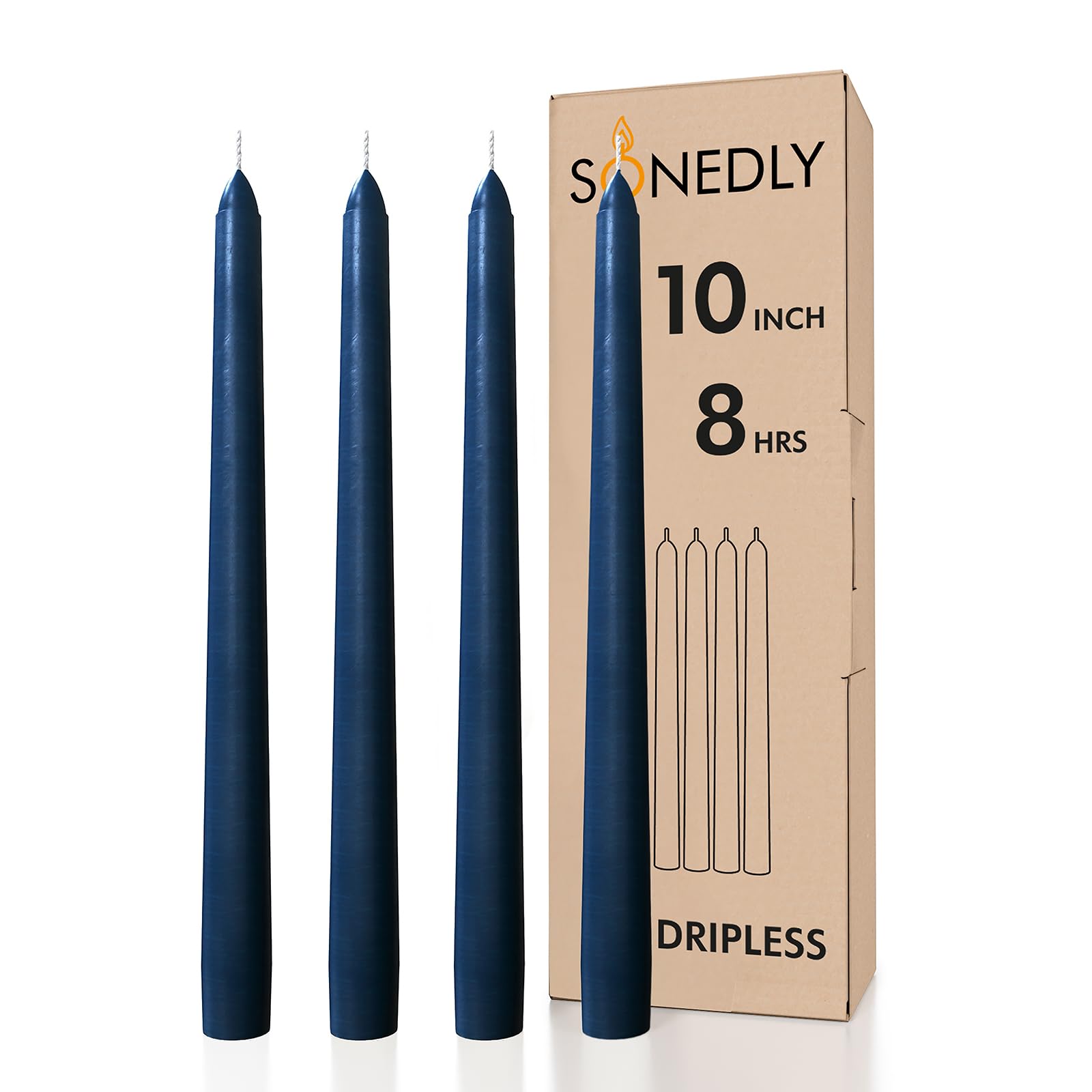 Stunning hand-dipped. We do our best to create outstanding tapered candles, that's why we are so meticulous during the production. We make the navy blue taper candles 10 inch with passion and love. We use only high-quality wax and 100% cotton wicks in the production of our Sonedly royal blue taper candles. Another important fact is that our long candles are fully-colored. Don't hesitate to order non toxic candles for home, they will live up to your hype. Appropriate for any event. Do you want to arrange a romantic evening for your significant person? Or have you bought a new apartment and want to arrange everything according to "Feng Shui"? Our pretty candle sticks dripless for home will be a gorgeous decoration for any event. There’s something magical about tall navy tapered candles' soft, twinkly illumination. Our taper candles long burning will please you for 8 hours filling the atmosphere with real magic. Best quality. We are eager to create real craftsmanship and live with beautiful things. The same we wish to you. Create aesthetic around you and live in comfort you deserve. With our tapered candles navy it is possible. Sonedly smokeless and unscented 10 inch taper candles will not bother you with any allergy. The soft glow from the dripless taper candles will help you smooth out the rough edges of the day. Smooth and consistent flame. Navy taper candles are the warmest, most lively and original manifestation of fire in a house or apartment. Unlike conventional electric lighting, unscented candle create a special atmosphere of warmth and comfort, relaxation and tranquility in the house. Our decorative candles for home decor are dripless and have a perfectly steady flame which will charm you. The only thing you need is to follow some tips and create good conditions for burning. Key ingredient in your interior. There is just something really warm and inviting about a room with the look of a flickering long lasting candles in it. Using decorative dark blue taper candles at home creates an intimacy that sets a mood to a room and makes guests feel really welcome. Right accessories as tall candle can really transform the look of any area in your home. No matter where you decide to use a dinner candles, they’ll create a warmer, more welcoming environment.