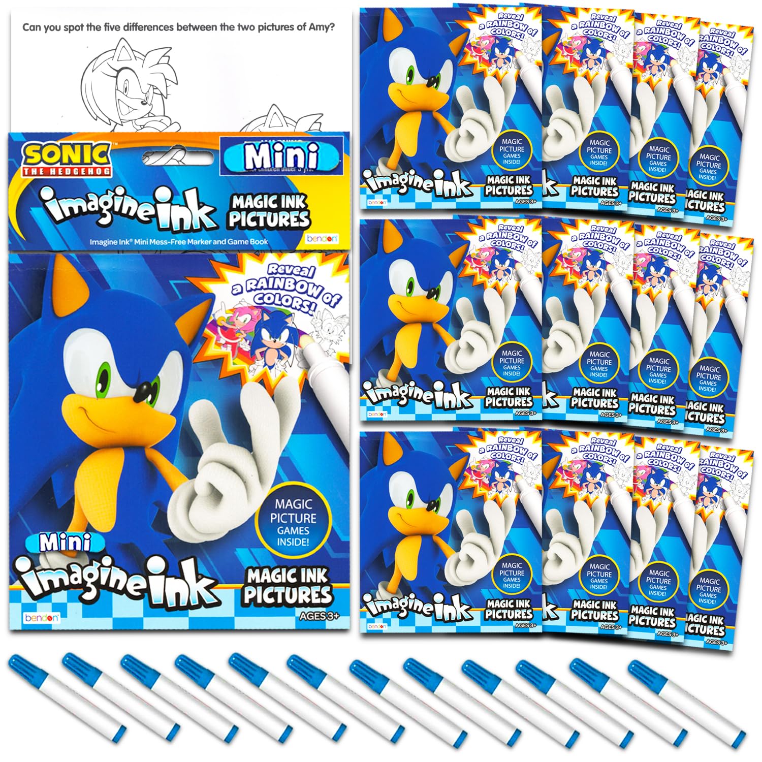 Sonic the Hedgehog Mess Free Coloring Book Set - Party Favor Supplies Bundle with 12 No-Mess Magic Imagine Ink Activity Books for Kids. This Sonic The Hedgehog set includes 12 Sonic magic ink game books. Each book contains 5 pages of no mess coloring fun and a mini magic ink marker. Use the magic marker to reveal a rainbow of colors on every page as you play with characters from Sonic The Hedgehog. Non-toxic magic pen prevents stains on cushions, couches, rugs or other material. Perfect to hand out as party favors at birthday parties for girls and boys alike, this Sonic imagine ink set fits perfectly into loot bags, goodie bags, and treat bags of all sizes. Officially licensed Sonic toys and games products. Great for kids. Sonic the Hedgehog Mess Free Coloring Book Set - Party Favor Supplies Bundle with 12 No-Mess Magic Imagine Ink Activity Books for Kids. This Sonic The Hedgehog gift set includes 12 Sonic magic ink game books. Each book contains 5 pages of no mess coloring fun and a mini magic ink marker. Use the magic marker to reveal a rainbow of colors on every page as you play with your favorite characters from Sonic The Hedgehog. Non-toxic magic pen prevents stains on cushions, couches, rugs or any other material. Perfect to hand out as party favors at birthday parties for girls and boys alike, this Sonic imagine ink set fits perfectly into loot bags, gift bags, and treat bags of all sizes. Officially licensed Sonic toys and games products. Great for kids.