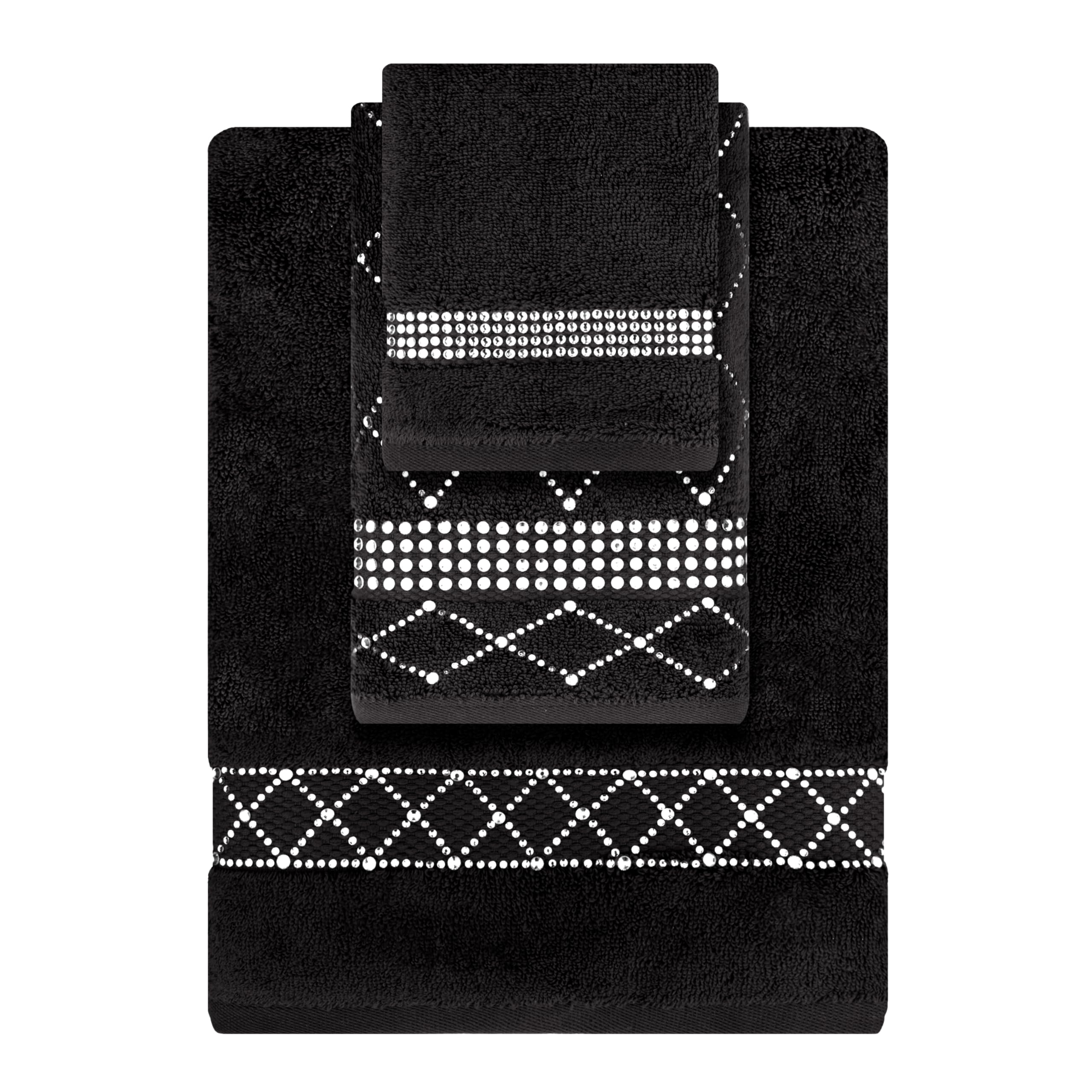 SPARKLING DESIGN: Give your bathroom a contemporary makeover with our 3 Piece Towel Set featuring a bold X design. The stylish pattern, embellished with glistening rhinestones, offers a modern twist on the classic towel. This chic design instantly adds an elevated, sophisticated touch to your bathroom decor, making these towels a luxurious statement piece in any space. GLAMOROUS DETAIL: Each towel is adorned with genuine glass rhinestones arranged in a striking X shape. The rhinestones catch and reflect light with every movement, creating a dazzling effect that adds an extra layer of elegance. These sparkling accents are the perfect balance of glam and simplicity, making them ideal for those who appreciate subtle luxury. PREMIUM MATERIALS: Crafted from 100% Turkish cotton, these towels are soft, absorbent, and built to last. The plush cotton fibers ensure a comfortable feel against the skin, while the durable construction promises long-lasting performance, even with regular use. Experience the ultimate in luxury as you use these high-quality towels. COMPLETE SET: This towel set includes three essential pieces: a fingertip towel (13" x 13"), a hand towel (16" x 30"), and a bath towel (30" x 52"). With these three sizes, you’ll have the perfect towel for any bathroom task—from drying your hands to wrapping up after a relaxing bath. Choose from a variety of elegant colors to match your bathroom’s existing decor and elevate your space with a coordinated look. EASY ITEM CARE: Maintaining the beauty of your towel set is effortless. Simply place your towels in a garment bag, wash on a delicate cycle with cold water, and lay flat or hang to dry. The high-quality cotton and rhinestone embellishments are designed to withstand gentle care, ensuring your towels stay soft, vibrant, and sparkling for years to come. "Our 3 Piece Towel Set with X Design puts a stylish spin on traditional bath towels. Featuring glistening rhinestones that form a chic X design, these towels are a luxurious addition to your daily routine. These towels not only exude opulence but are also built to withstand regular use. The durable cotton terry material ensures that they maintain their plushness and absorbency over time. Featuring genuine glass rhinestones, the towels catch the light and shimmer with every movement. Choose from a palette of eight vibrant colors, allowing you to match or contrast with your existing decor. The set includes a fingertip towel measuring 12” x 18”, a hand towel measuring 16” x 30”, and a bath towel measuring 30” x 52”, each with a unique X design that adds a touch of modernity to the classic towel set. Machine-washable, these towels are easy to keep clean. Just wash on a delicate cycle and then lay them out to dry."