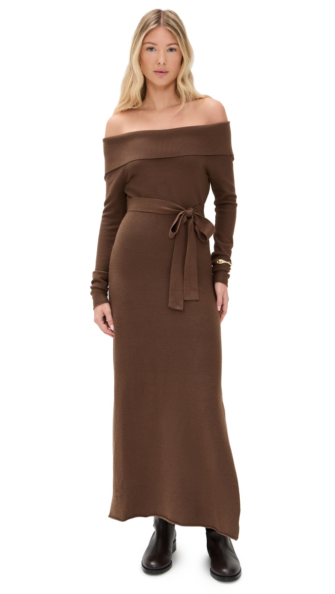Fabric: Mid-weight stretch knit Thigh-high side slit Maxi length Off-shoulder neckline