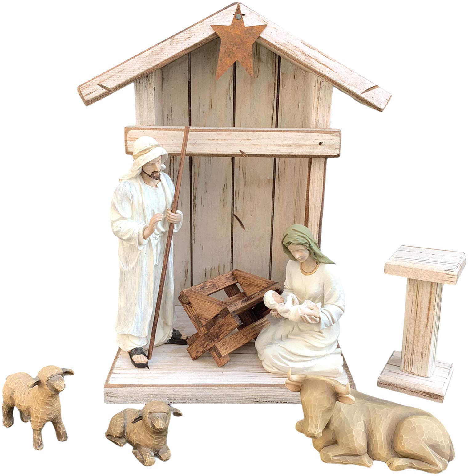 Handmade in the USA- 3 Colors available- Antique White, American Walnut Brown, Sage Green Stable Size- H-14" x W-11.5" x D-8.25". Baby Manger- Oak wood with a walnut stain. Size-3.25"W x 3.25"D x 2.75" H. Angel Stand- Color: Antique White - Size- 5.25"H x 2.5"W x 2.5" D. Sign- The custom laser engraved sign is a perfect way to personalize your stable! Lights- String of fairy Led lights has 20 lights, 3 volt battery, 6 hour timer, 8 modes of light settings to choose from. Comes packaged so you can wrap it however you'd like, +2 extra batteries included Figurines are Not included. Included: 1 Wood Stable only. The evergreens and figures are pictured for display. Accessories are available to add on to your order. There is No additional shipping for the accessories when purchased with a Stable. Please read dimensions carefully. This Custom Stable is made from Real Wood. Wood grain, Knots and Distressing may vary makeing each stacle unique. This Wood Stable is a beautiful Stable for a Nativity Set. It works Perfectly with many nativity sets, and fits the Willow Tree Nativity set. Nativity pieces are Not Included. The baby manger, angel stand, custom sign, & lights are available for to customize this stable. Each stable will vary & have it's own unique "handmade touch"! The stable is made in our shop in MN. It is made out of wood with a tin rusty star on top.