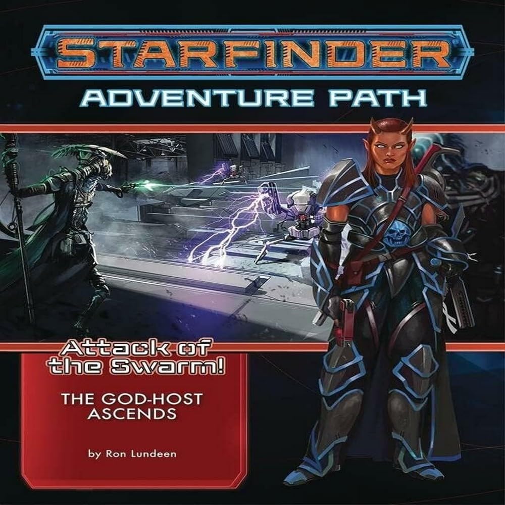 The heroes have sent the Swarm into disarray, but the entity called the God-Host still stands on the verge of completing its plans. To ensure an end to the threat, the heroes at last return to their overrun homeworld―but this time with the might of an entire military behind them! Only by finally defeating the massive God-Host can the PCs break the will of the Swarm army and bring peace back to Suskillon! “The God-Host Ascends” is a Starfinder Roleplaying Ga.me adventure for four 11th-level characters. This adventure concludes the Attack of the Swarm! Adventure Path, a six-part, monthly campaign in which the heroes fight back against a ruthless and nigh-unstoppable alien invasion.This volume also includes an article on continuing the Adventure Path's story with new threats, an assortment of new military vehicles, and a selection of new Swarm monsters and other deadly threats. Each monthly full-color softcover Starfinder Adventure Path volume contains a new installment of a series of interconnected science-fantasy quests that together create a fully developed plot of sweeping scale and epic challenges. Each 64-page volume of the Starfinder Adventure Path also contains in-depth articles that detail and expand the Starfinder campaign setting and provide new rules, a host of exciting new monsters and alien races, a new planet to explore and starship to pilot, and more!