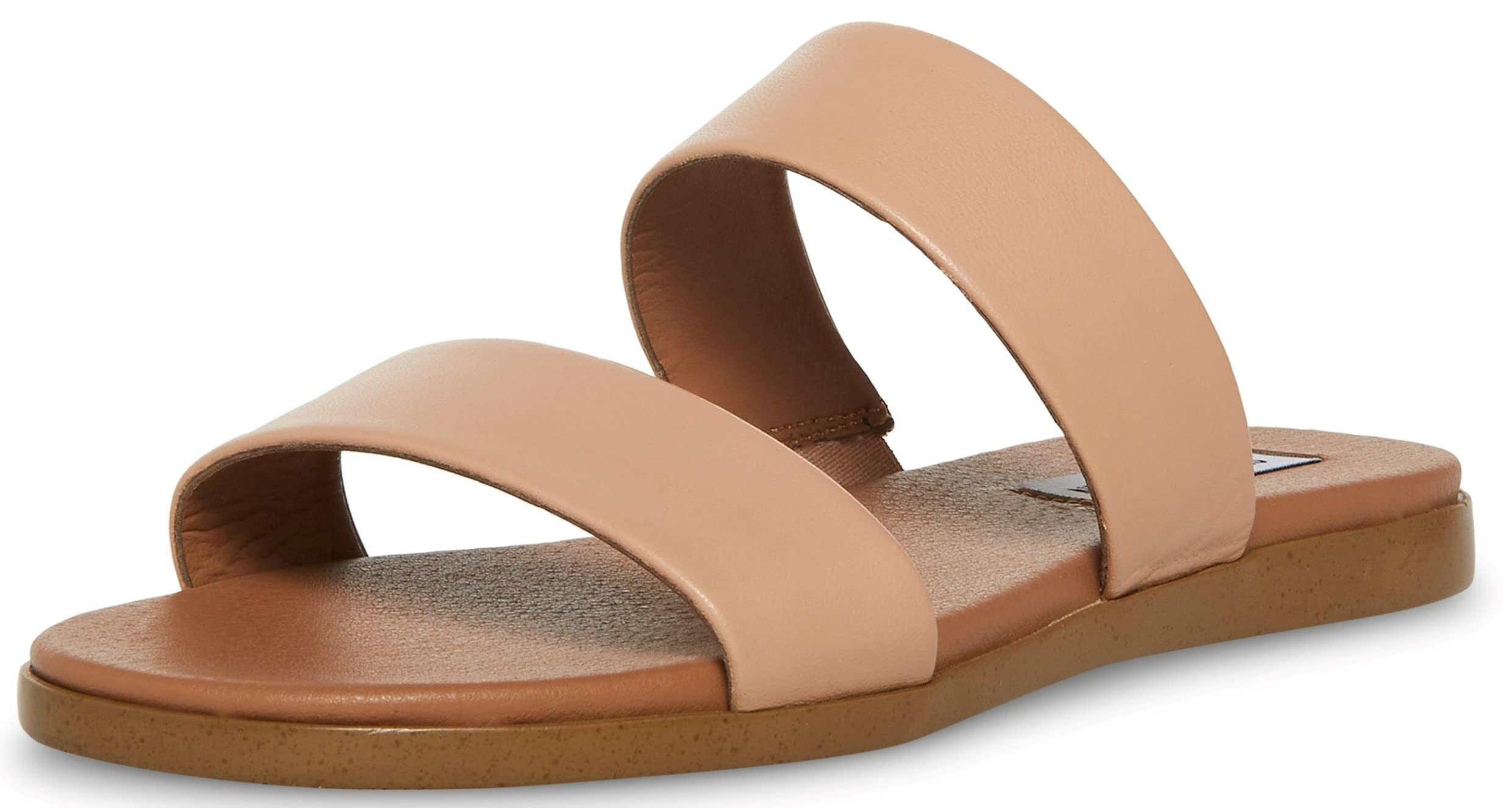 Steve Madden Triple Strap Leather Upper Flat Slip-On Sandal Cushioned Footbed 1" Platform Partnering two upper straps with a flat sole, the DUAL sandal offers a simple, clean look that’ll complement minimalist and bohemian ensemble alike. Pair the slide with a breezy peasant dress for a getup that’s as comfortable as it is chic.