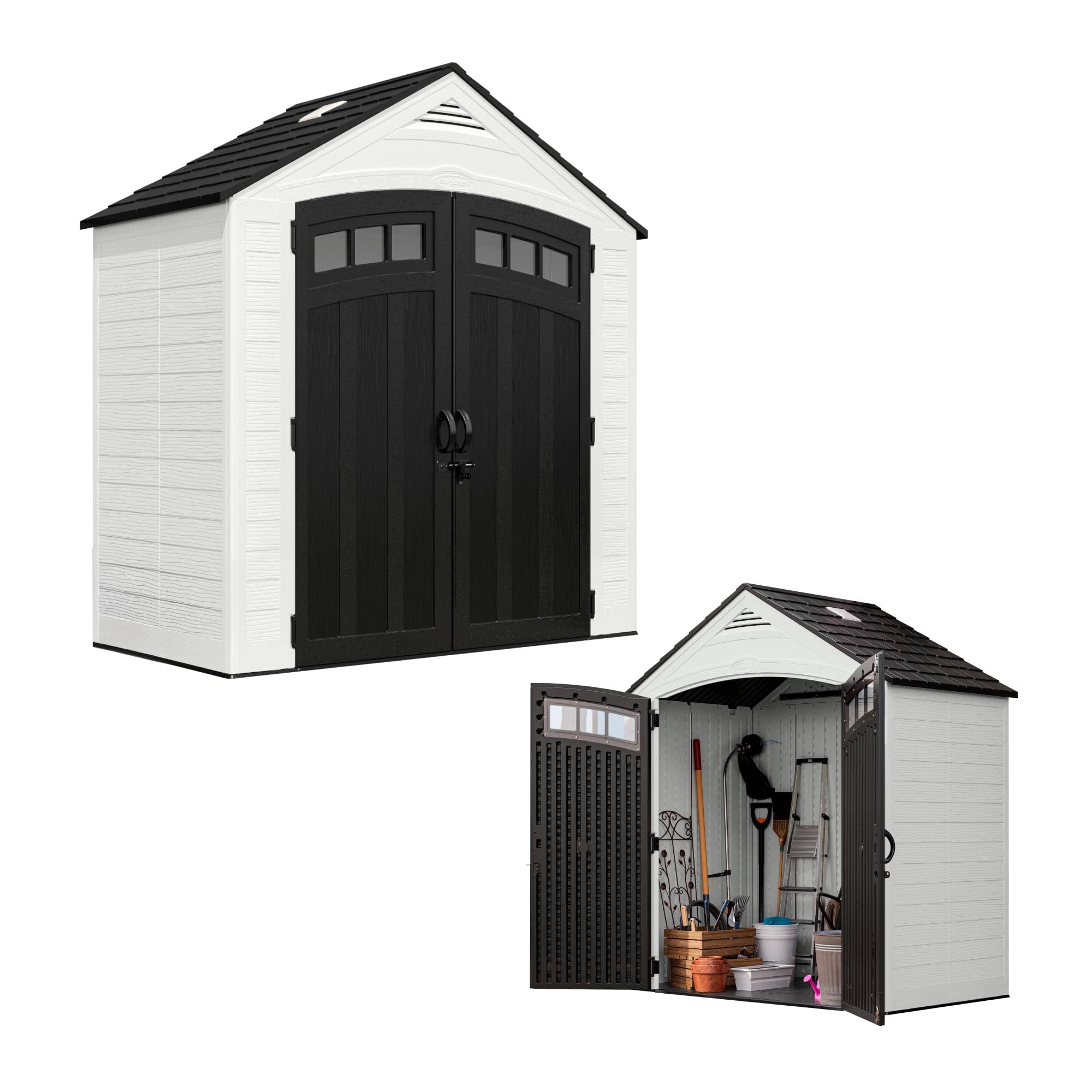 7' x 4' OUTDOOR STORAGE SHED: Features 187 cu. ft. of space for ladders, long-handled tools, planters, gardening equipment, and more while fitting nicely along a house or garage when yard space is limited PAD-LOCKABLE DOUBLE DOORS: Large double-door entryway provides easy access to stored belongings, and the doors feature a pad-lockable metal hasp to prevent theft and unauthorized use (padlock not included) HEAVY-DUTY CONSTRUCTION: Metal reinforced, multi-wall resin panels provide water resistance and UV protection for all-weather durability, while the reinforced resin floor withstands heavy loads INNOVATIVE ILLUMIVENT SYSTEM: Suncast's IllumiVent system helps maintain proper air circulation to reduce humidity and air temperature while also bringing natural lighting to the interior as you work FUNCTIONAL AND ATTRACTIVE: Easy to clean and maintain and boasts a classic shed design with architectural details and shingle-style roof panels to look great in your yard all year long