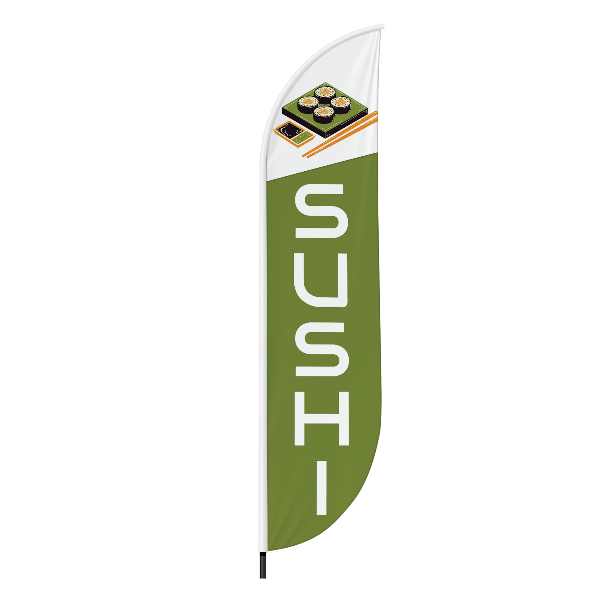 EXCLUSIVE DESIGNS: These Swooper Flags set of 3 have exclusive designs created by our in-house artists. Use these flags to spread awareness and generate more income for your business, restaurant, or stores. Our advertising sign banner flags deliver incredible value at an affordable price and will pay for themselves in a matter of minutes! Laser cut crisp edges for better appearance and less wear and tear over time. Front side print for superior picture quality. PRINT QUALITY: Printed on one side, backside same image but in reverse. We use a premium Feather Flag/Swooper Flag made of 100% lightweight polyester fiber, double-stitched seams, universal in all seasons, smooth surface for best printing results. The banner is printed with high-quality ink to ensure that the graphics and text are vibrant and clear. Our inks are UV safe and will last for years. EASY VISIBILITY, WINDLESS DESIGN, and AMAZING RETURN ON INVESTMENT: Bright and vibrant colors allow people driving by at high speeds to easily view and read these flags. A must-have for highways and busy intersections. The windless design offers the Swooper flag to be visible & clear even without wind. These advertising signs usually pay for them within hours, if not minutes. EYE-CATCHING DYNAMIC DISPLAYS: Our Flags will be very eye-catching for indoor and outdoor use and make your location or events stand out, the flying feather banner will grab attention at a distance to attract many new Crowds to your Site. The feather banner size is very large (11.5ft x 2.5ft) and visible enough from far away, you may put the feather banner up in front of your business, at the entry, or on the sidewalk, really a must-have and cost-effective way to increase traffic to the business COMPATIBLE WITH 13" TO 15" POLES: Purchasing this item will include the large feather flag only. This feather flag can be used with straight poles sets ranging from 13" to 15" in height. This flag only works with windless swooper pole. (Note: 15" pre-curved pole sets are not compatible). NOTE: ALL OUR PRODUCTS ARE MADE IN USA. This product includes one 11.5ft x 2.5ft feather flag. Feel free to contact us if you need assistance with design, ordering, or installation. We have our in-house designers who are ready to assist you. Sushi Feather Flag(11.5feetX2.5feet) by DreamController