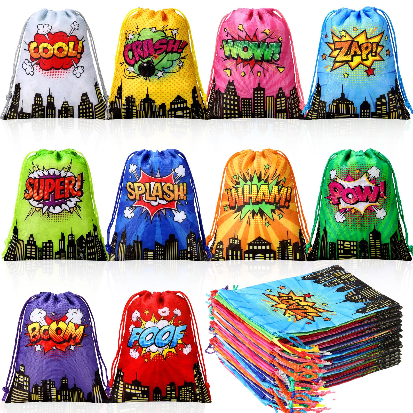 Large Amount: you will receive 30 pieces hero drawstring bags, printed with 10 different patterns, and each pattern have 3 pieces; This quantity will meet your needs for themed parties usage, share them with your good friends at hero themed parties Compact yet Versatile Storage Solution: measuring 7.1 x 5.1 inch, the hero party favor bags neatly hold snacks, gift cards, toys, or essentials like wallets and tissues; Their size makes them ideal for party favors, classroom rewards, or travel-sized organization without bulk; Note: the product may have a measurement error of about 1 cm Durable Polyester Construction for Repeated Use: hero bag crafted from tear-resistant polyester with reinforced stitching, these bags withstand frequent handling and reuse; Unlike paper gift bags, they won't rip easily, offering long-term value for parties or daily organization Hero Theme Design: these hero backpacks designed with 10 different hero related patterns, printed with [ SPLASH], [BOOM], [WOW], [POW], [CRASH], [ZAP], [Cool], [WHAM], [POOF], feature colorful cities on both sides, as well as heroes, good supplies on hero themed parties Multi Occasion Flexibility: beyond hero parties, use these hero party favor bags for comic conventions, birthdays, school events, or baby showers; Doubles as quirky decor when hung or displayed, adding a color to any space Features: Budget friendly party essential: a cost effective pack of 30 ensures you're prepared for multiple events. Reusable bags reduce waste compared to single-use alternatives, appealing to eco-conscious shoppers seeking practical party supplies. Crowd pleasing appeal: the playful, action packed designs instantly engage guests, making them memorable takeaways. Kids love collecting different patterns, while adults appreciate the functional yet festive touch for event planning. Specifications: Material: polyester Color: as show Size: 7.1 x 5.1 inches/ 18 x 13 cm Package includes: 30 x Hero party favors bags Notes: Manual measurement, please allow slight errors on size. The color may exist a slight difference due to different screen displays.