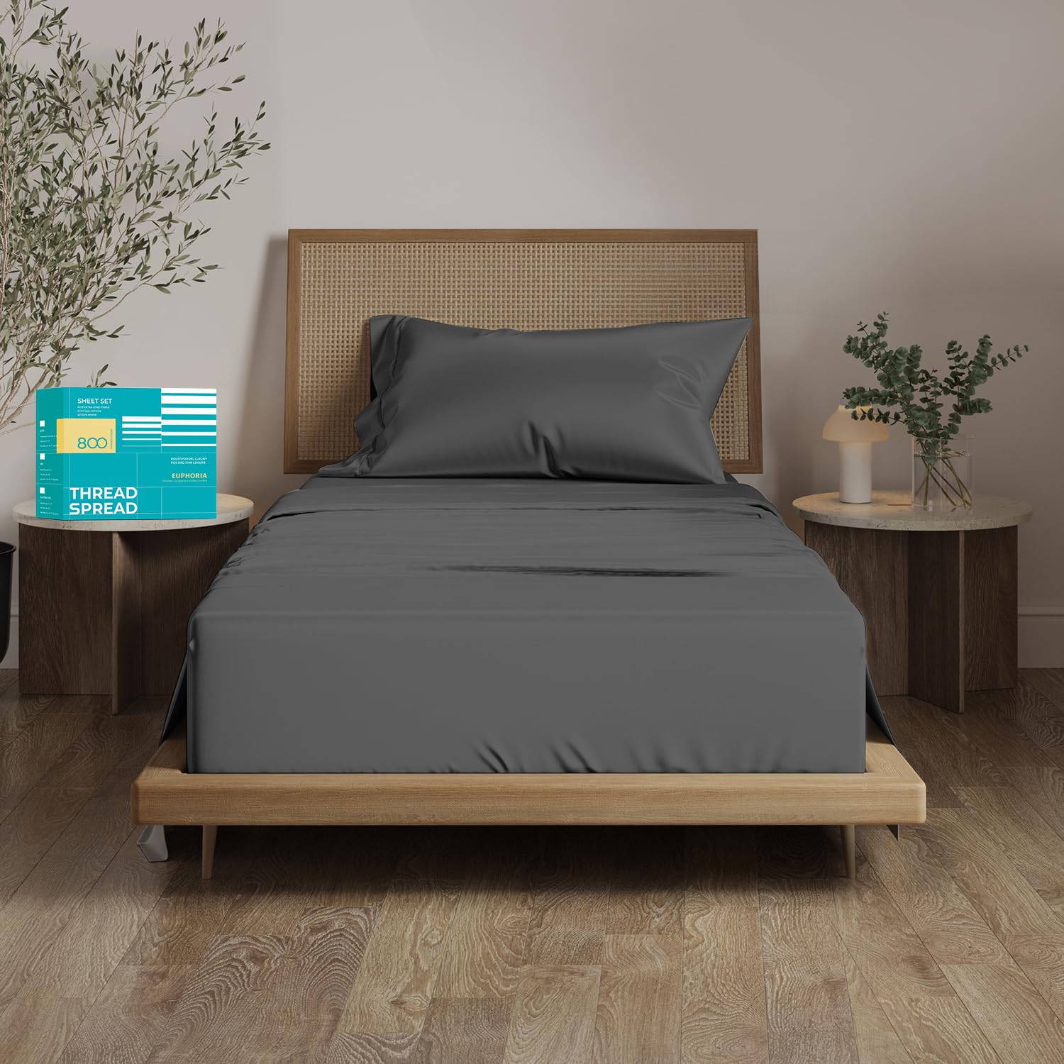 Luxurious Five-Star Hotel 100% Egyptian Cotton Sheet Set: Crafted from 100% Extra Long-Staple Egyptian Cotton, our sheet sets are softer and more durable for improved plushness. The 800 THREAD COUNT cotton bed sheets are buttery smooth and silky with a rich sateen weave that adds luminous touch to the bedding. These are heavyweight, cooling, and breathable for the ultimate five-star hotel luxury and all-season comfort What Comes In The Set?: Our Twin XL Size Sheet Set Has 3 Pieces: 1 Top Flat Sheet (66” W x 96” L), 1 Fitted Bottom Sheet (39” W x 80” L + 16"), and 1 Standard Size Pillowcase (21” W x 32” L). The fitted sheet has deep pockets to fit adjustable mattresses from 8 inches to 16 inches deep. Clever HEAD/FOOT Tags help you to make the bed easily. Pair this dark grey cotton sheet set with a matching comforter and duvet cover to elevate the home/room decor Safe For You & Your Family: Cotton is naturally-sourced and earth-friendly, unlike microfiber and other linens that are not ideal for your health and skin. At Thread Spread, we focus on healthy and quality living, and our luxury sheets are certified as STANDARD 100 BY OEKO-TEX to be free from harmful substances Care Instructions: Thread Spread recommends washing the sheets at least once a week. You can either tumble dry or hang the sheets outside to dry. These egyptian cotton quality sheets are resistant to shrinking, fading, and pilling. The fabric opens up in a few washes and becomes softer and smoother. Remove these luxury bed sheets from the dryer as soon as the cycle ends to prevent wrinkles You Matter The Most: We’re confident that you will love our cotton bed sheets. In case you're unhappy with the purchase, we have a flexible return/refund policy to get the items exchanged or refunded. You can also gift our best Egyptian cotton sheets to your loved ones on Mother’s Day, Father’s Day, Women’s Day, Men's Day, Christmas, Valentine's Day, Halloween, Weddings, Vacations, and Autumn Holidays WHAT’S IN THE BOX? ● One Flat Sheet measuring 66” W x 96” L ● One Fitted Sheet measuring 39” W x 80” L + 16” deep pockets ● One standard Size pillowcase measuring 21” W x 32” L MEET THE HIGHEST-QUALITY COTTON THREADS: Made from 100% extra-long staple cotton and a lustrous sateen weave that lends a classic touch. Buttery smooth and silky hand-feel, this 800 TC hotel collection sheet set is prized for its ultimate luxury, all-season comfort, and super softness and durability. UNIQUELY SOFT & COOL IN ALL SEASONS: Signature extra-long staple cotton sheets provide a cooling & light sensation to keep you ventilated in summer. These 100 percent cotton sheets regulate body temperature and keep you breathable while sleeping. Best for hot sleepers who sweat at night. FREE FROM TOXINS & HARMFUL CHEMICALS: Sourced from natural and organic processes, our egyptian cotton quality sheets are sustainable and earth-friendly compared to microfiber and other fabrics. Our cotton bed sheets are certified as STANDARD 100 BY OEKO-TEX to be free from toxins and harmful chemicals, assuring the safety of your family and the kids. DESIGNED FOR YOUR COMFORT & LUXURY: We make bedding that is both stylish and functional. The fitted sheet has extra deep pockets to snugly fit mattresses from 8 inches to 16 inches deep. The clever head/foot tags are labeled on the short side to help you make the bed easily. Pillows stay in place with envelope closures. MADE DIFFERENTLY, MADE FOR YOU: We are deeply committed to sustainable practices—from sourcing raw materials, creating high-quality sheet sets, to ensuring fair and ethical treatment to our artisans and farmers. We make bedding that is safe, soft, and comfortable, without sparing any details to make our bedding luxurious. Try us and see the difference in your quality of sleep!