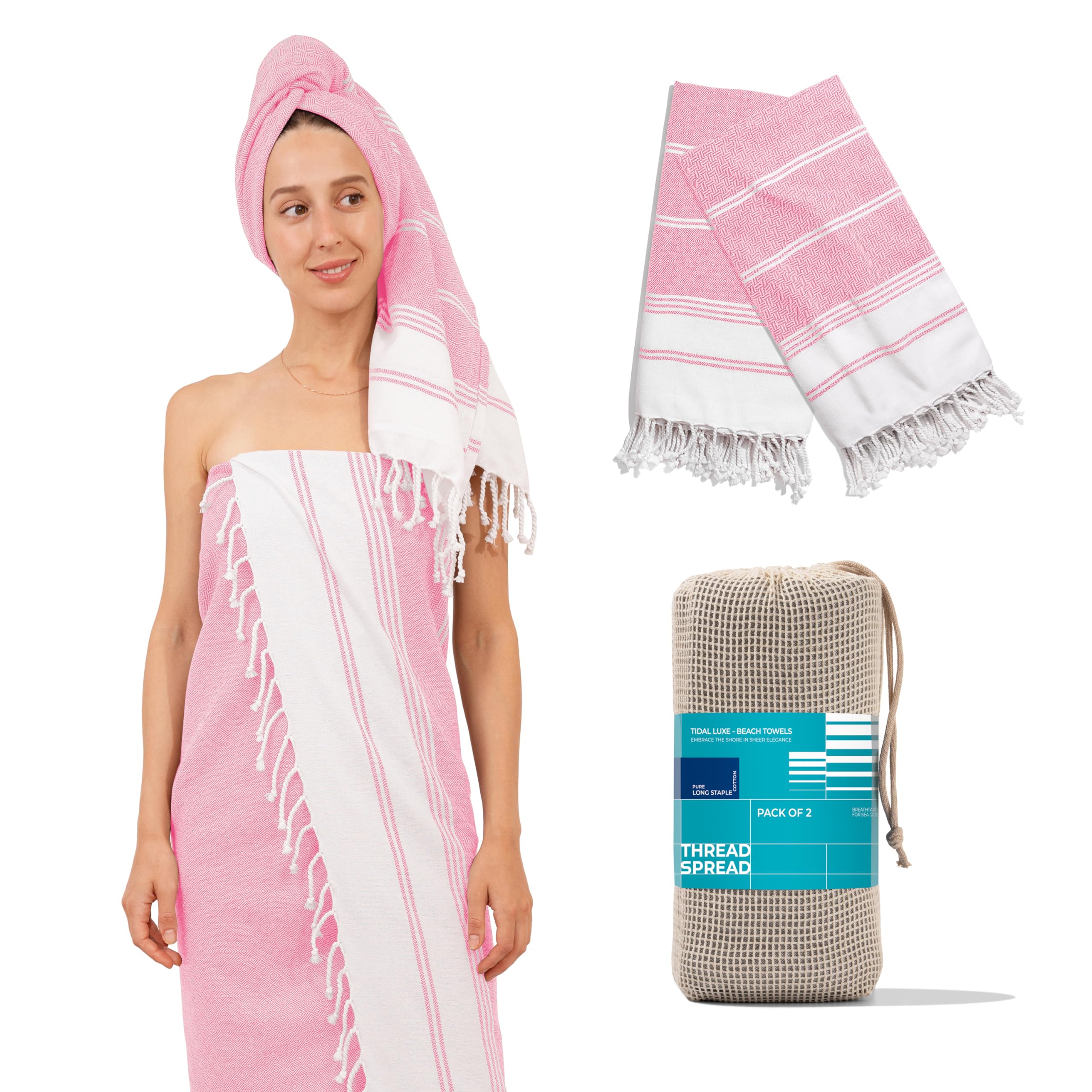 Super Absorbent & Quick Dry Beach Towel: Embrace the sun’s warmth and ocean’s embrace with Thread Spread’s Tidal Luxe Peshtemal Beach Towels. Our 100% cotton beach towels are pre-washed for natural softness and absorb water from your body in seconds. Unlike those bulky towels, our thin beach towel are quick drying and doesn’t leave a damp smell behind. Forgot to put them in the wash after your beach trip? Not a problem anymore! Completely Sand-Resistant 100% Cotton Beach Towels: Unlike thick towels that hold onto the sand, our lightweight beach towel has a smooth surface which makes it easy to brush away the sand. Perfect travel beach towel for all your summer needs! Available in three variants: Herringbone, Chambray, and Diamond to fit your lounging style Lightweight & Compact Beach Towel Set: Comes in a bulk pack of 2 (39” x 71”) and a netted bag, our turkish beach towel for adult don’t take up too much space in the luggage or wardrobe. They roll up to the smallest size possible and are SO convenient to pack and store. Best for your next beach getaway! Use Them However You Want: Our sandproof & oversized beach towel can easily double down as a surf towel, gym towel, pool towel, hand towel, camping towel, bathroom towel, kids beach towel, picnic towel, etc. Or you can wrap them around as a blanket, sarong, or a shawl. Whatever purpose you have, our cute beach towel fulfills them! Wash & Care Instructions: Wash our oversize large beach towel in a machine in cold water. Tumble dry low. Our striped beach towels don’t shrink or lose their color. There is Zero fraying, pilling, or threads coming loose. Instead, our cotton beach towels maintain their softness and color Hit the beach with your new favorite Thread Spread’s sand resistant beach towel. Made from soft cotton, these luxe towels not only feel great on your skin but look darn good in your collection. Unlike those bulky and thick towels, our sandless beach towel doesn’t let the sand or dirt stick to the surface. Available in classic & coral stripes, these packable beach towel is oversized yet compact enough to fit in your bag or store in the closet easily. Our compact beach towel rolls to the smallest size possible so you can easily pack and carry them with you. These come as a beach towel 2 pack measuring 39” x 71”. Designed for quick drying than swim towels and regular bath towels, our extra large beach towel don’t leave a damp smell behind. These large oversized beach towels soak up more water from your body quickly, so you can take a dip in water as many times as you like and then dry yourself off immediately. Our quick dry beach towels for travel are great to relax on the beach and wrap yourself up completely after a dip. This big beach towel is comparable to a blanket or shawl, making it an excellent choice for all your summer activities. Not hitting the beach anytime soon? Our multipurpose peshtemal towel sets can be put to several uses. These oversized beach towels for adults can be used as a surfing towel, gym towel, pool towel, cabana, face towel, camping towel, and shower towel. You can also use them as bath accessories, picnic towel, washcloth, blanket, and more. Get these beach essentials for swimmers. Our luxury sand proof beach towel are popular as gifts for men, women, kids, and even dogs! Maintaining the quality of our beach towel cotton is easy. Wash them in cold water in the machine and tumble dry low. Avoid fabric softener, bleach, and ironing. These turkish beach towels oversized are resistant to pilling, shrinkage, and fading—and don’t lose their original softness on the wash.