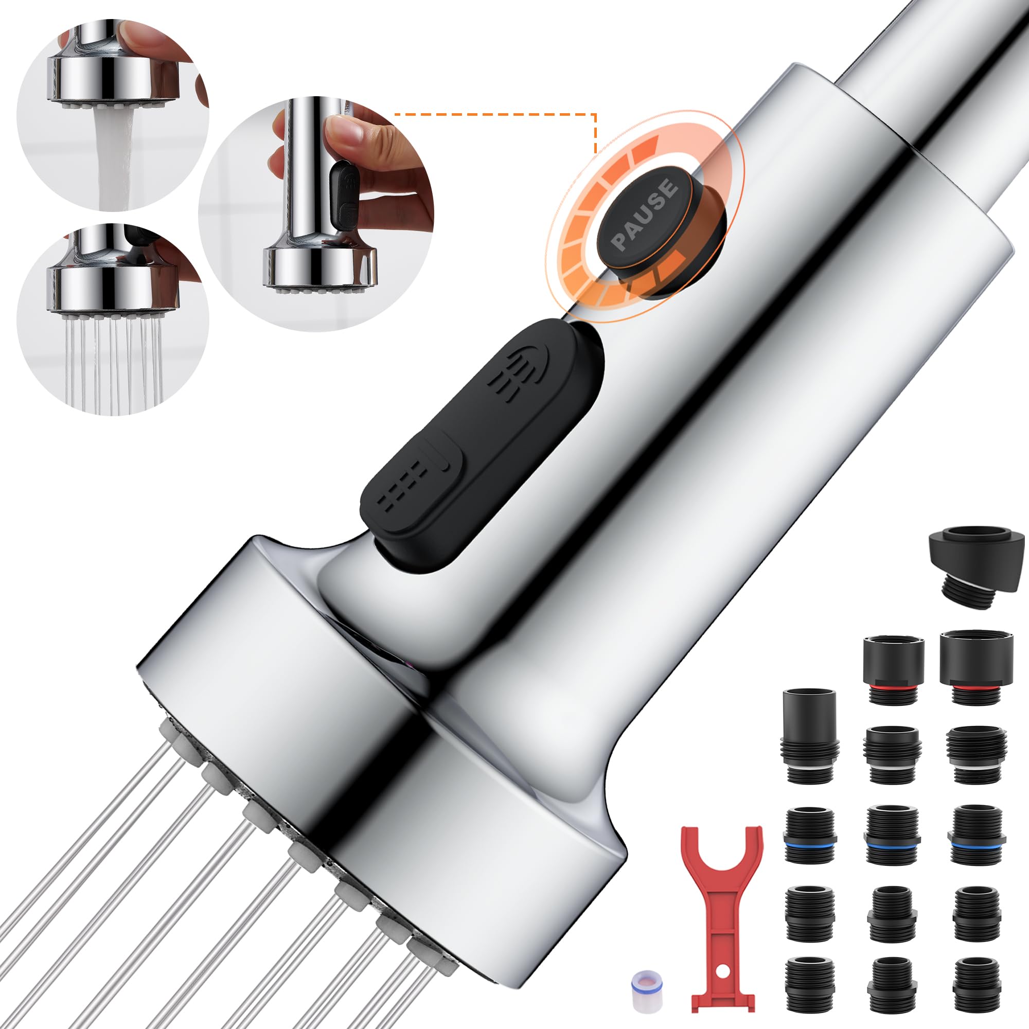 Not compatible with all faucets, Please check the faucet size before ordering with 15 Adapters: This kitchen spray head replacement comes with 15 adapters compatible with major brand faucets from American Standard Faucets, compatible with Kohler, Hansgrohe, Grohe, Moen, Delta and more Switching Between 3 Functions: The chrome kitchen sink faucet head replacement has 3 modes: stream, spray, and pause modes; Simply press and release the button to switch between 3 modes, there are different modes to meet your cleaning needs Easy to Install: Just unscrew the old faucet spray head and replace it with this new one; (Please choose from the 15 adapters provided that are compatible with your faucet) High Quality: This chrome faucet sprayer head is made of high quality ABS plastic and a brushed nickel finish for durability; It is made of silicone nozzles, easy to clean; It's a replacement for the broken one that came with the faucet, you don't need to buy the whole kitchen set Easy to Clean: Our pull down kitchen faucet spray head comes with a free gadget included for removing the aerator and tightening the adapter to the faucet; The aerator can be removed and cleaned to ensure clean and flowing water "Chrome Pull Down Kitchen Sink Faucet Spray Head Replacement with 15 Adapters, 3-Function Sink Spray Nozzle for Kitchen Faucets