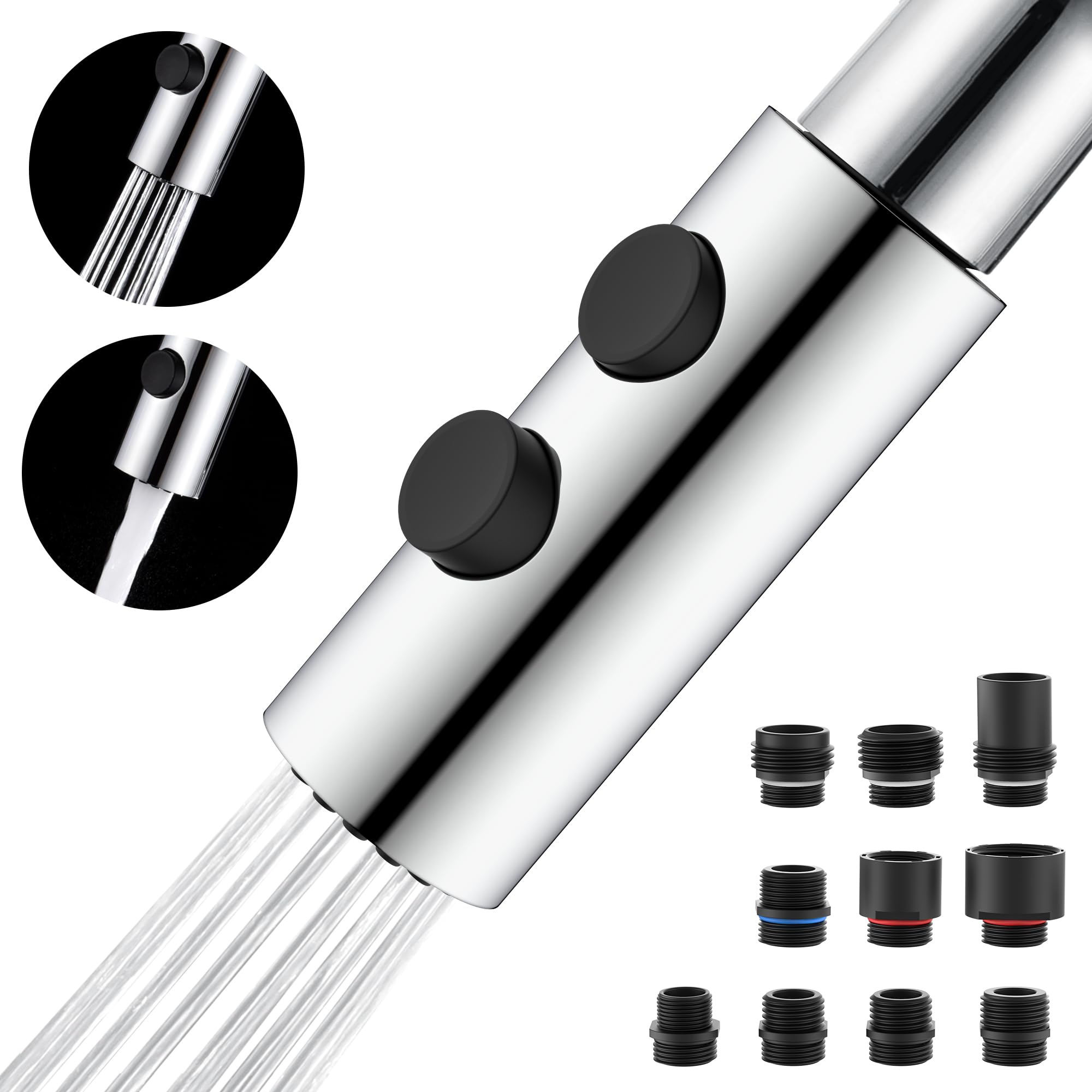 Metal Material: This kitchen faucet head replacement is made of high-quality rust-resistant 304 stainless steel that is both elegant and comfortable; There will be no water dripping, as long as you install it properly Not compatible with all faucets, please check the faucet size before ordering With 15 Adapters: This kitchen faucet spray head comes with 15 adapters allowing it to be compatible with most types of faucets from American Standard Faucets, compatible with Kohler, Hansgrohe, Grohe, Moen, Delta and more 2 Functions: Switching Between 2 modes; The pull down faucet replacement head has 2 modes: stream and spray modes; Just easily press different buttons, there are different modes to meet your cleaning needs Easy to Install: No plumber required, just unscrew the old faucet spray head and replace it with this new replacement head. With no professional help required, you can install it quickly and easily Comfortable Use: Selection of high quality multi-mesh aerator creates perfect aerated stream, more comfortable and no-splash, filtering out most impurities with 10 Adapters, Almost Universal with 10 Adapters - This kitchen faucet spray head comes with 10 adapters compatible with most types of faucets from American Standard Faucets, compatible with Kohler, Hansgrohe, Grohe, Moen, Delta, and more faucets. Not compatible with all faucets, please check the faucet size before ordering