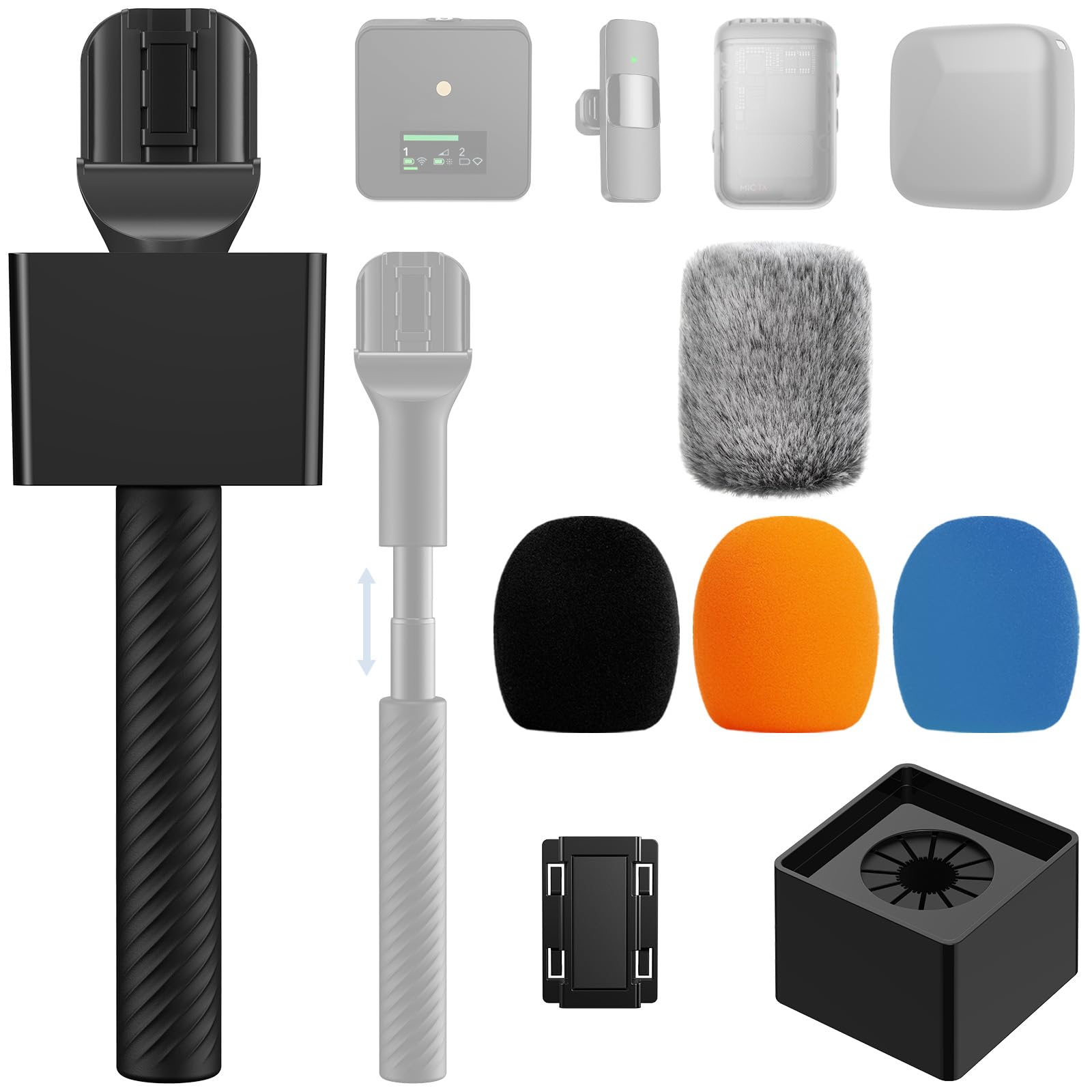 Compatible with All Wireless Lapel Mics: The TONOR microphone handle features an upgraded magnetic slot accessory, suitable for all wireless lapel mics on the market; compatible with MINI Mic, Mic 2, Wireless GO series, Lark series etc. Retractable Handle Design: The handle's length can be adjusted (range: 9.5''/24cm - 16.9''/43cm), allowing you to easily customize the length based on the distance to the interviewee; whether in a spacious studio or a tight outdoor setting, it captures clear sound details perfectly Two Premium Furry Windscreens: Made from premium materials, these furry windshield provide a secure fit on the handle, effectively reducing wind and ambient noise for improved recording quality; the logo-free design ensures the audience's undivided attention during your interviews Removable & Customizable Microphone Flag: The microphone flag can be easily detached and securely attached, ensuring it remains in place; you can personalize it by adding custom logo stickers, such as your channel emblem, to enhance the professional look of your recordings Wide Range of Applications: This handheld adapter converts your lapel microphone into a handheld one for easier use and a more professional touch to your videos; ideal for interviews, reporting, live streaming, YouTube, TikTok, podcasts, and more Portable & Sturdy: The telescopic rod is made of high-quality metal, and the main body is made of premium ABS, ensuring durability and sturdiness; weighing just 0.44 lbs (200 g), it features a non-slip rubber cover for a comfortable hold, making it easy to carry to any interview location TONOR Handheld Wireless Mic Handle Compatible with DJI RODE, Adjustable length Mic Stand Adapter for ALL Lavalier Microphone, Rig with attachable Channel Flag, Rubber Grip, Wind Muff, Furry Windscreen for Vlog, Reports, Interview, TP40